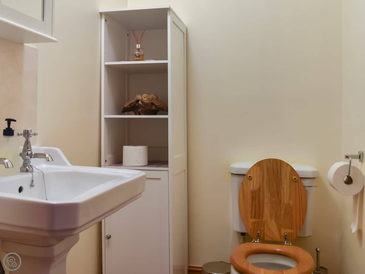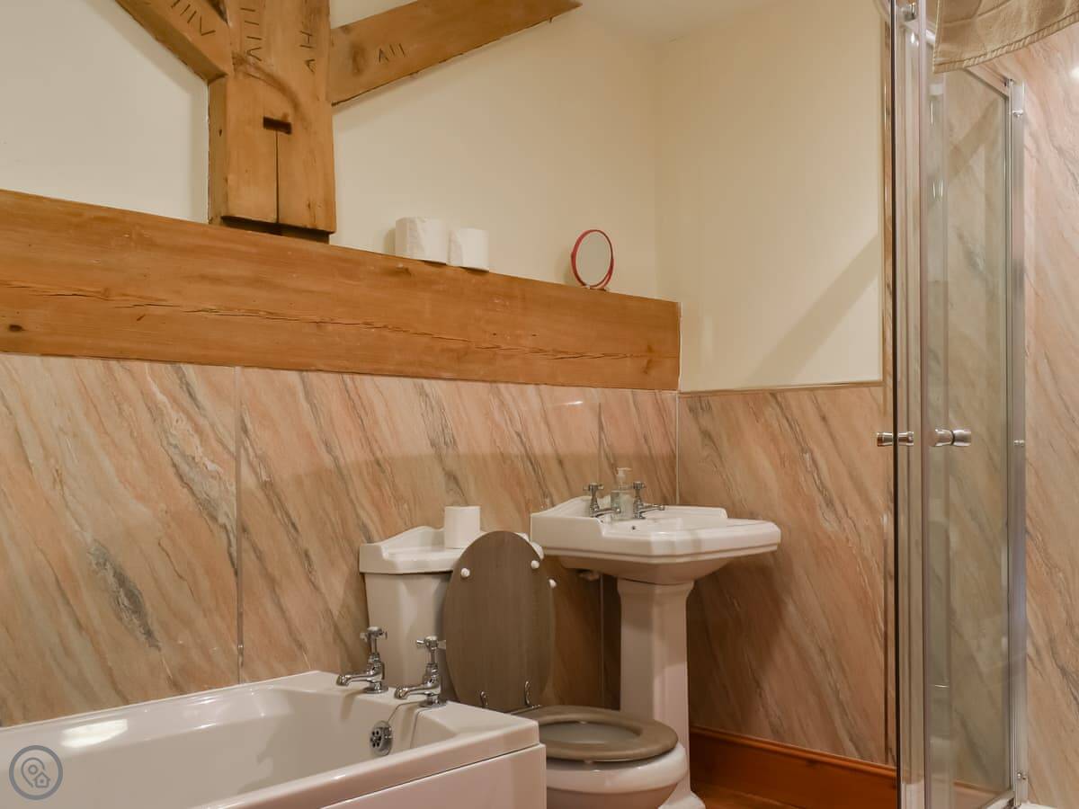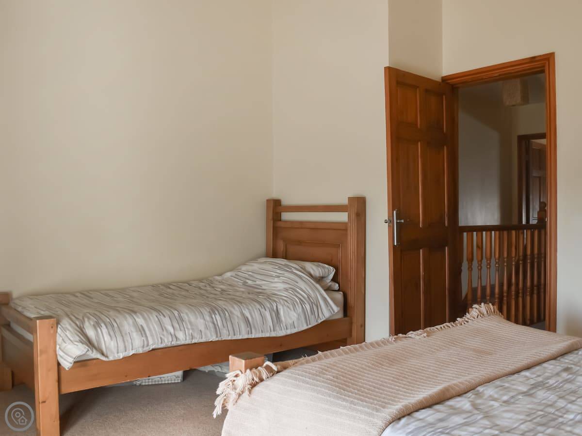 It sleeps six, but in two bedrooms. One room has a kingsize bed and a single. The other room has a double and a single. It's a 4 Star property, so it's comfortable and well-equipped, not luxurious. The bathroom has a bath with a shower over it.
