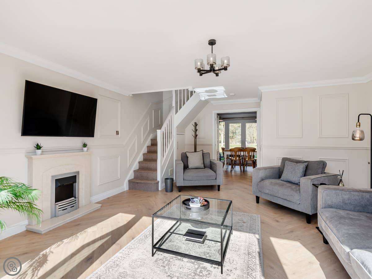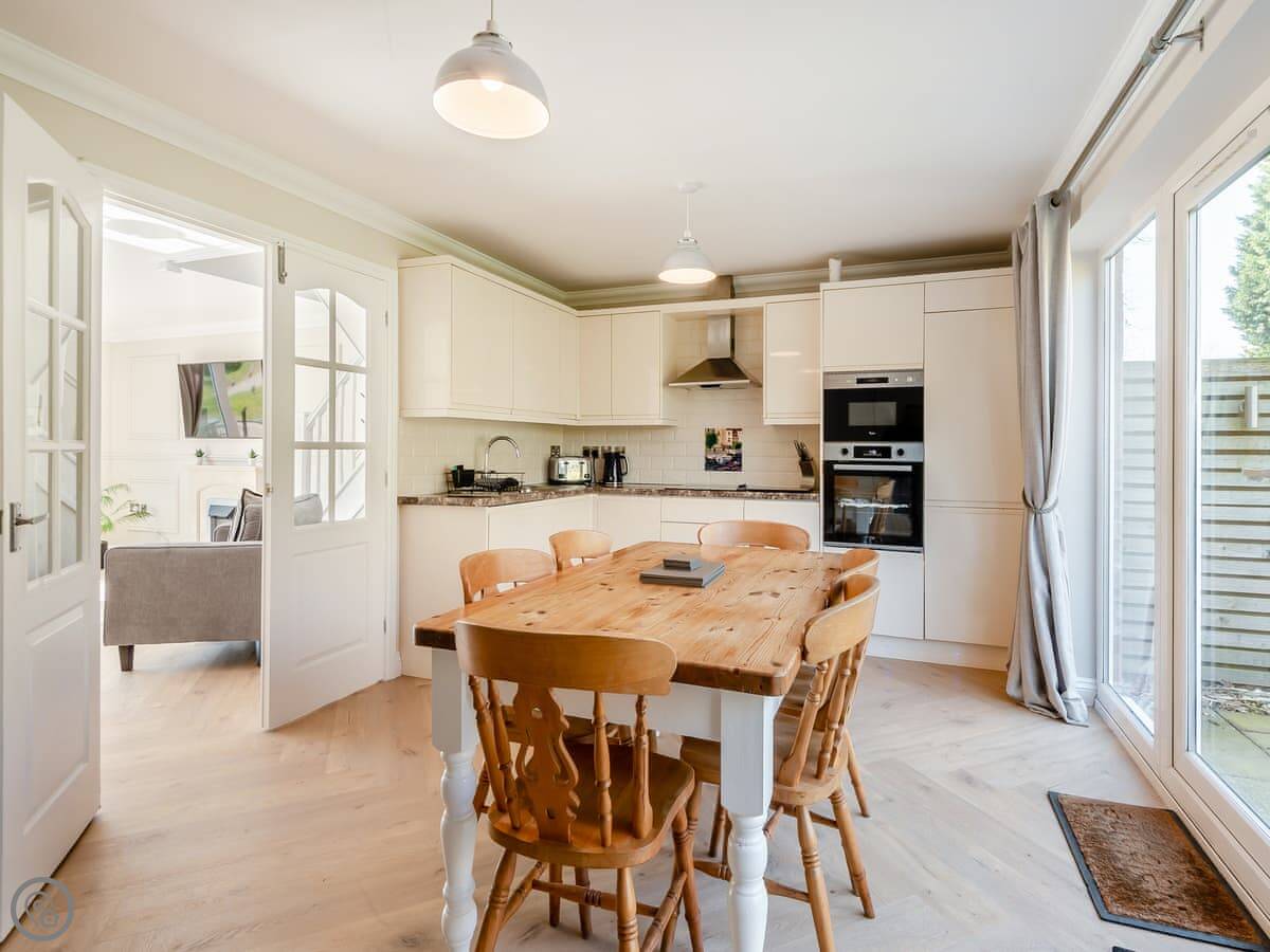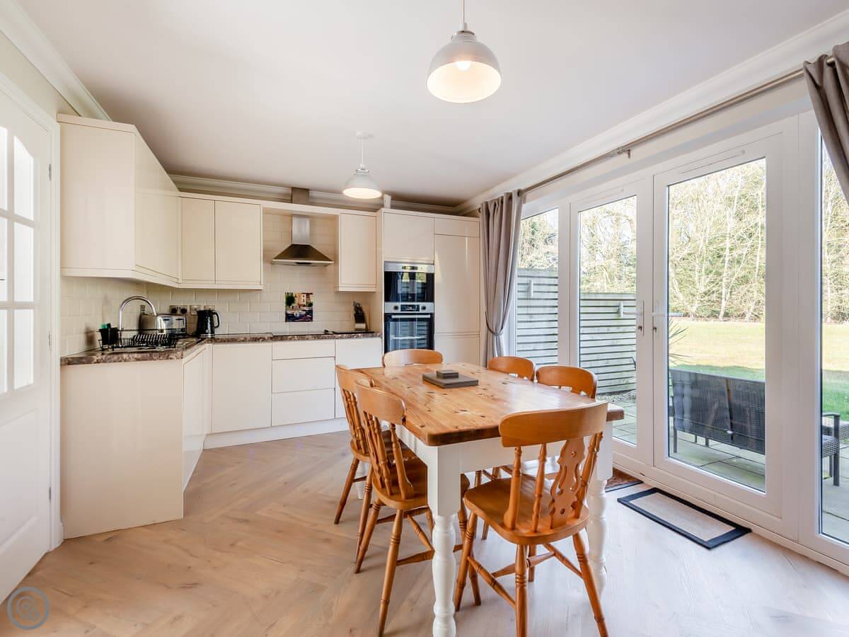 Inside, it's all on one level. There's a decent sized living area with a smart TV and doors out to the patio. The kitchen is separate, with a table for six, a dishwasher and fridge-freezer. It has everything you'd need to cook. There's also a downstairs loo.