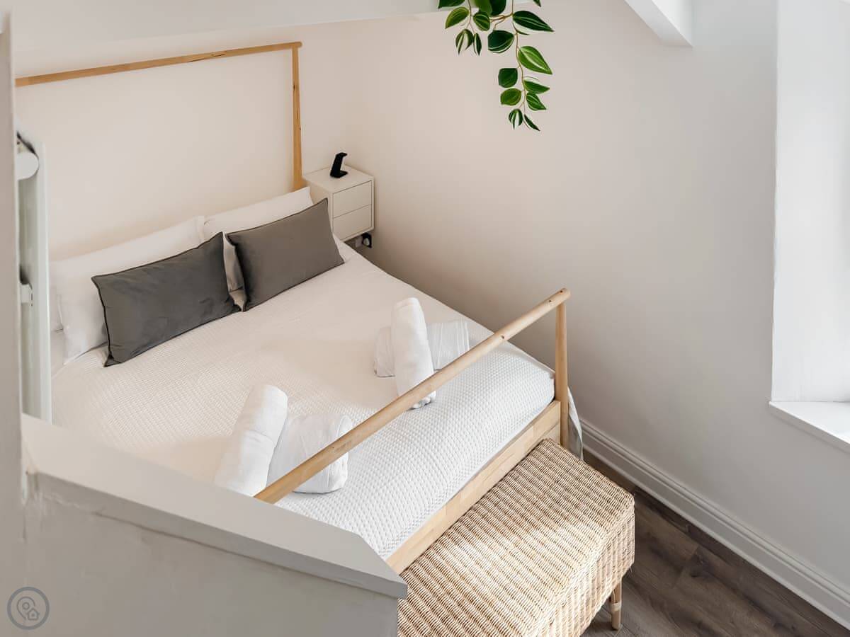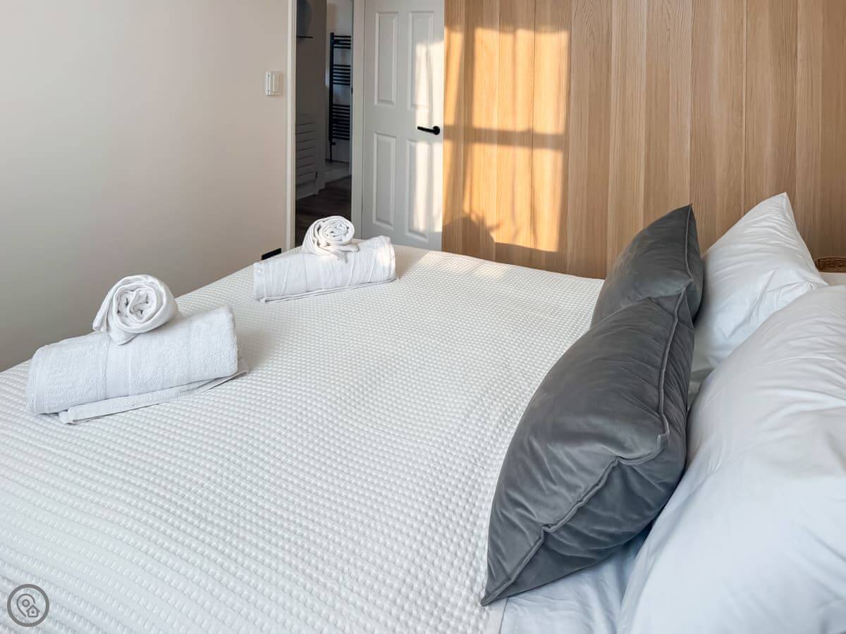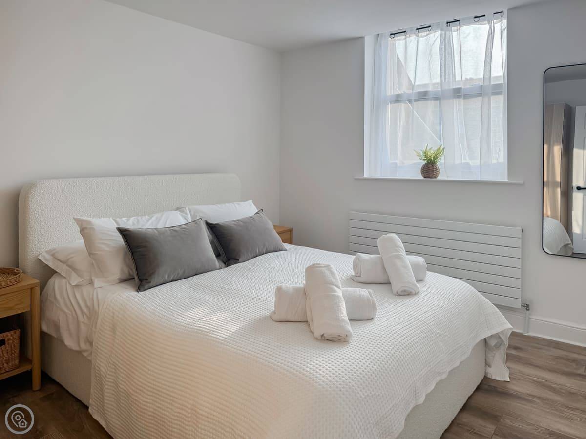 It sleeps four. Two bedrooms, one bathroom. It's got a 4 Star rating. The whole place is decorated in whites and greys, so it feels clean and light. The second bedroom is down a couple of steps from the hallway.