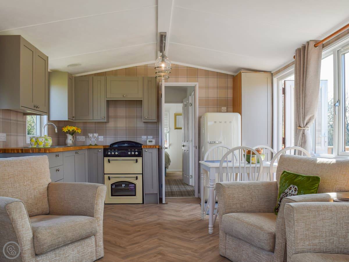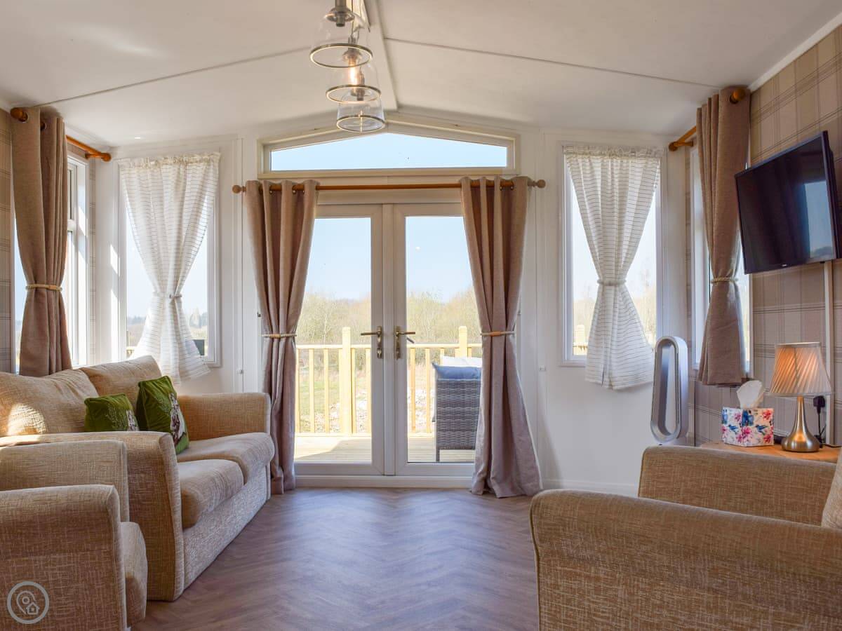 Inside, it's all open plan. Living area, kitchen and dining are in one room. There are French doors out to a big deck that goes around the side. You get a view over the fields. We get deer and hares out there sometimes.