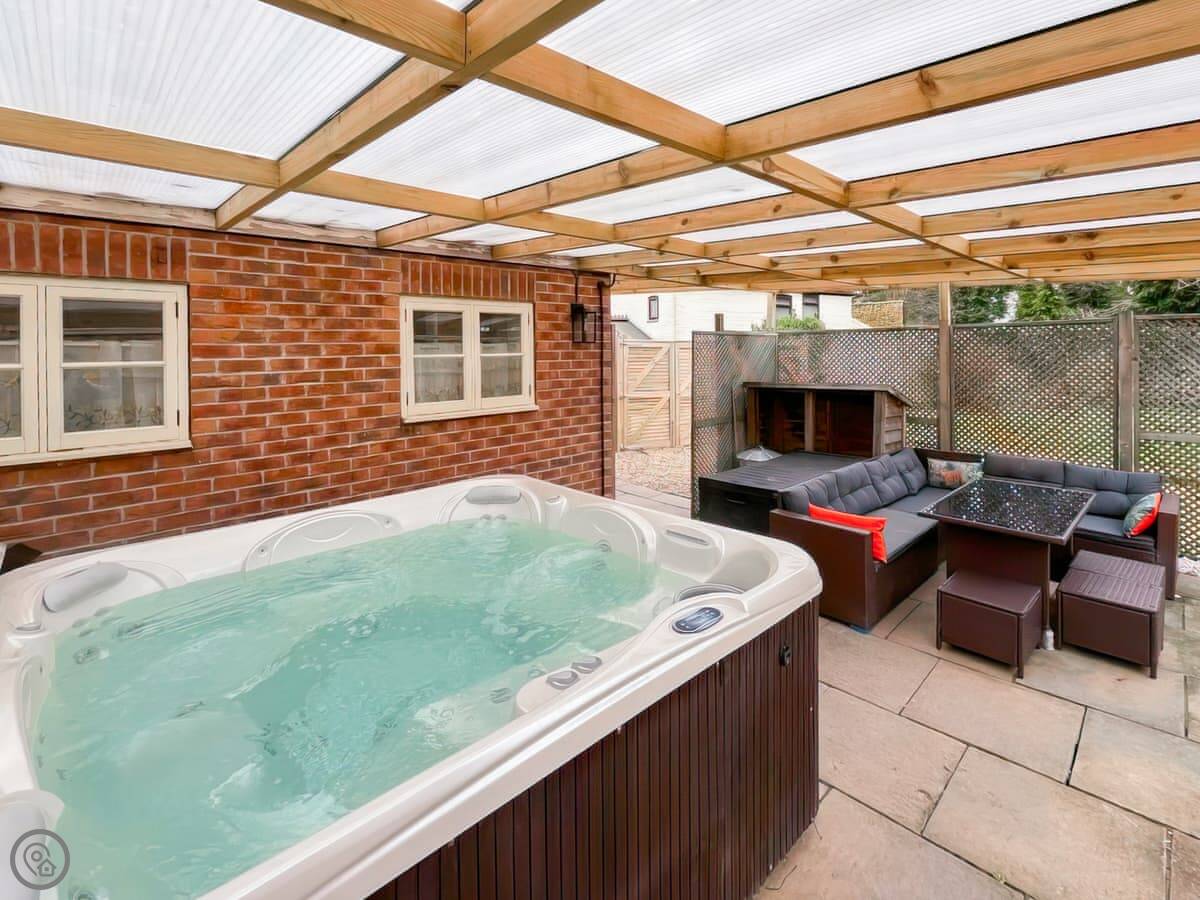 The garden is good and big. There's a hot tub there, which is private for you to use. The living space is open plan. It has a wood burning stove. There's a dishwasher and a washing machine. Parking is on site.