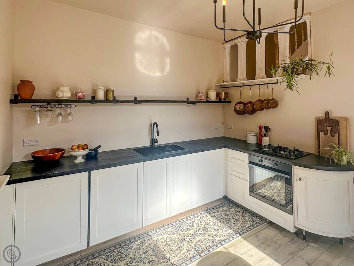 The living room is lovely and light. Big windows with a view of the sea. It's a proper Georgian room, so the ceilings are high and it feels spacious. It's got a 3 Star rating. That means it's clean and everything works, but it's not a boutique hotel. The kitchen is fine for cooking a meal.