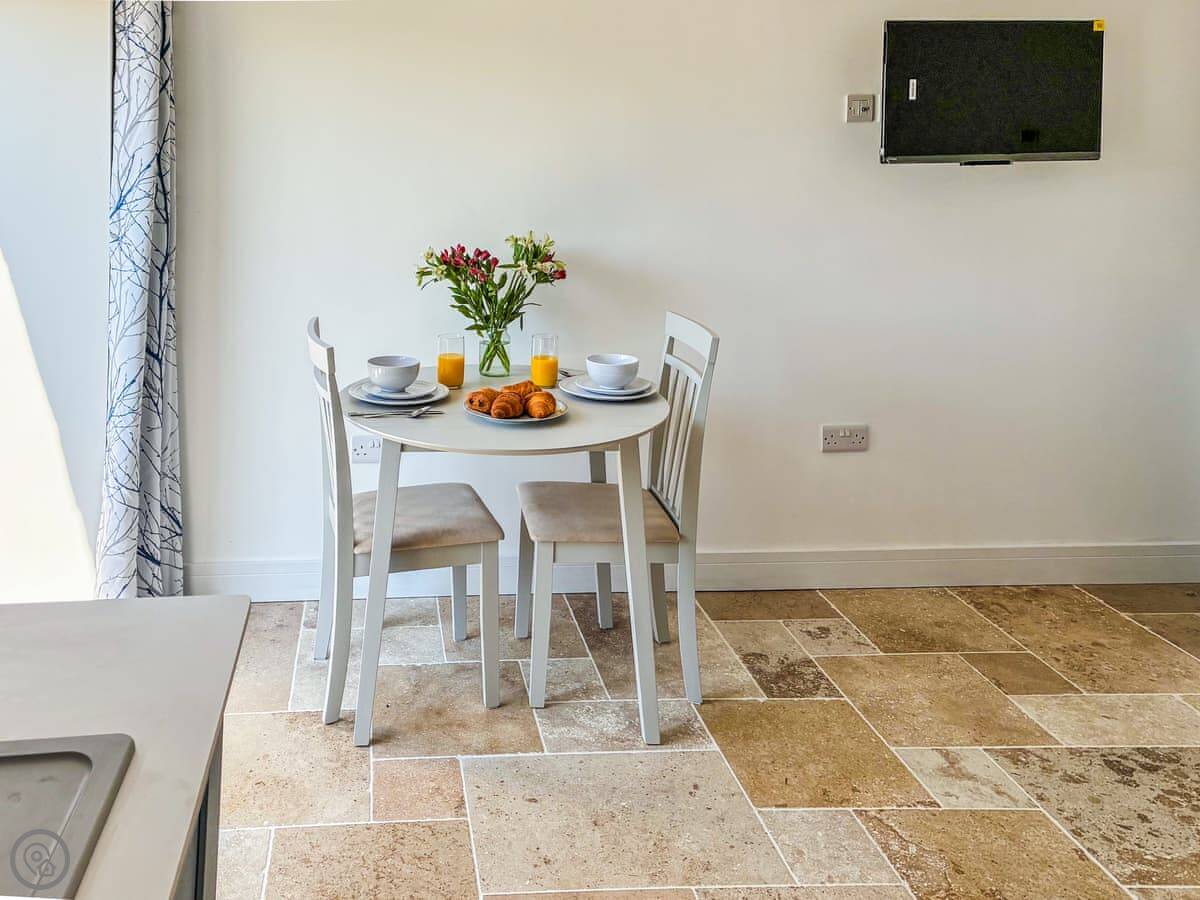 Downstairs is all one space, kitchen, living area, table. There's a dishwasher. You get a patio area out the front and a bit of courtyard out the back, both with chairs.