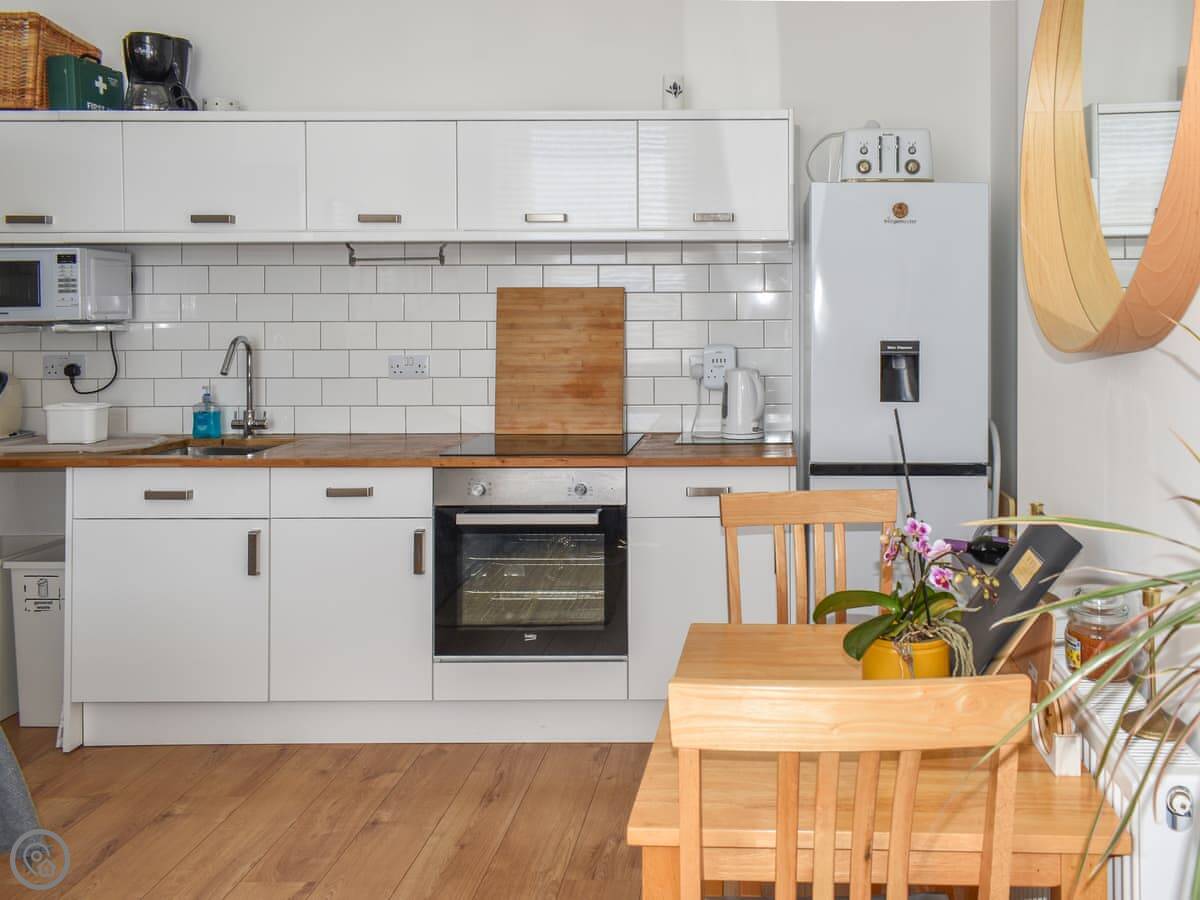 The main room is open plan: lounge, small kitchen, and dining area all together. That's fine for three people. The windows are large and arched, so it's very light. The view looks out over the downs, which is nice.