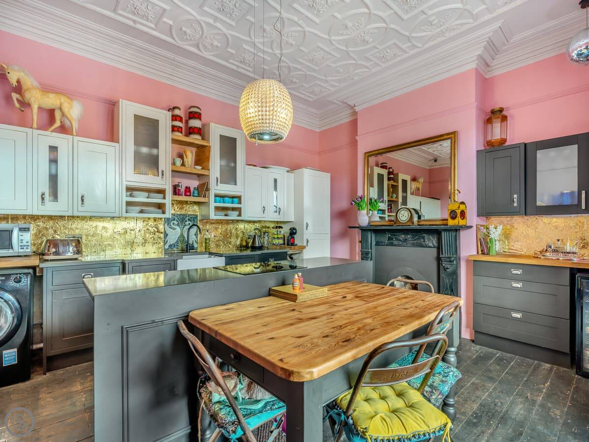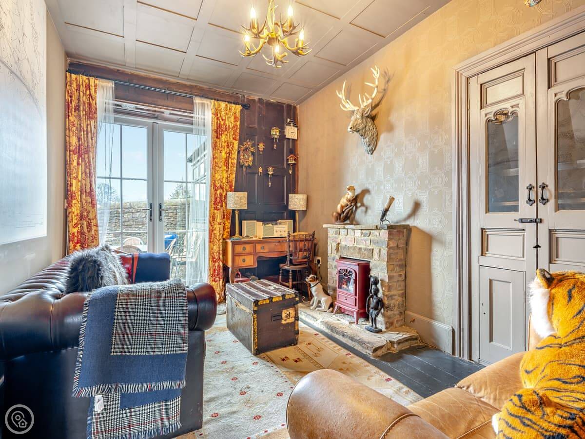 The main kitchen has a wooden floor and a decorative fireplace. There's also a bar area with a disco ball. The main living room has a proper open fire and two big Chesterfield sofas. There's a snug off that room with panelled walls and doors out to the garden.