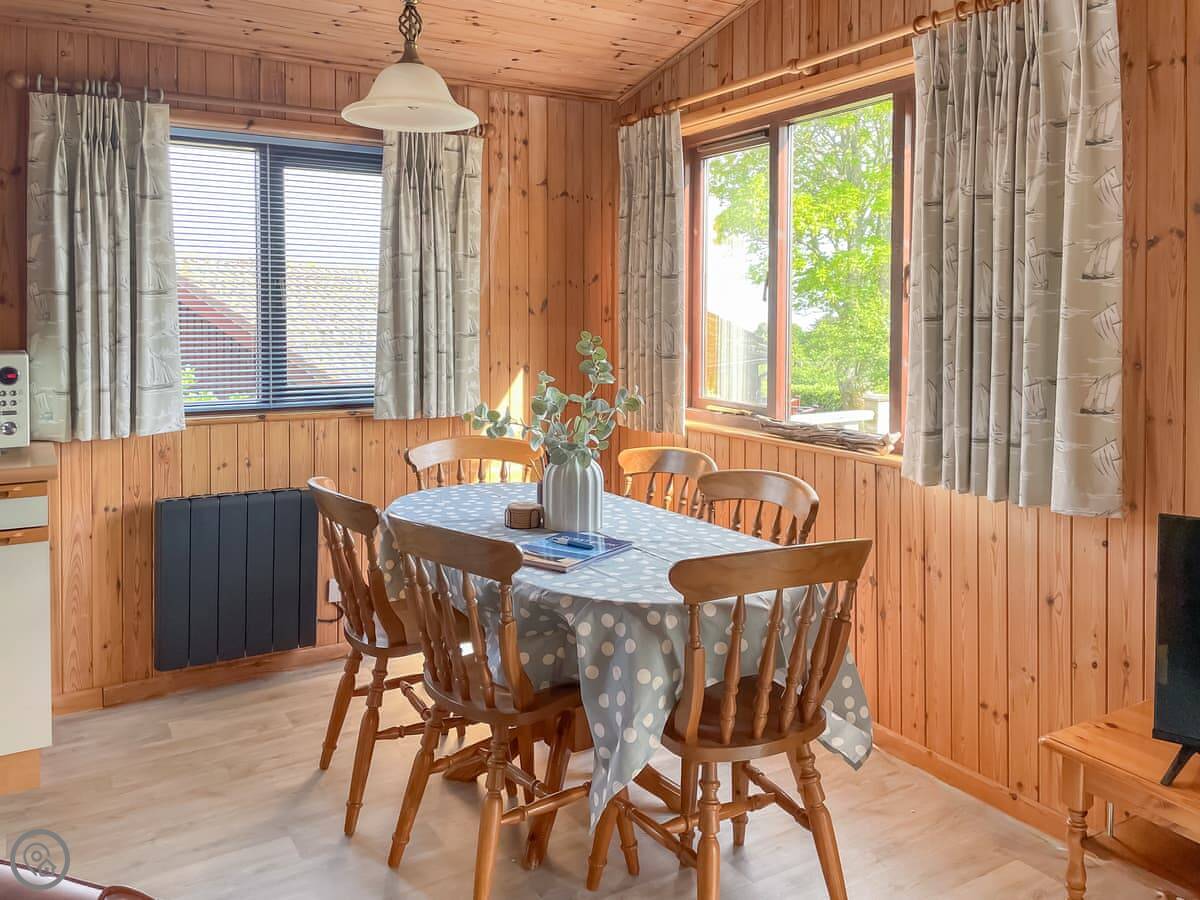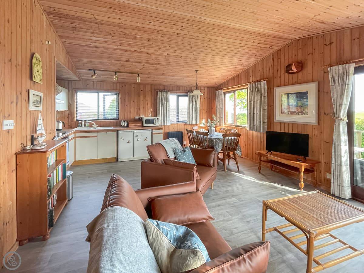 Inside, it's open plan. There's a washing machine, dishwasher, WiFi and TV. Bedding and towels are included. We can provide a cot and highchair. There's an electric vehicle charger on site.