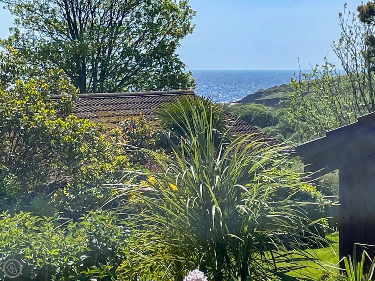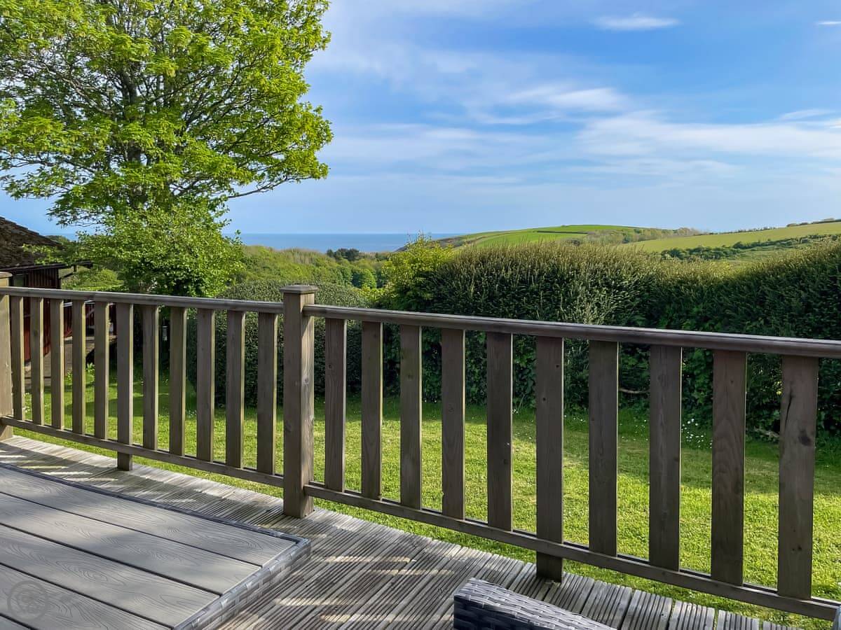 You get a private deck that looks out over the fields and you can see a bit of the sea. There's a hedge of camellias at the front which is nice. Parking for two cars.