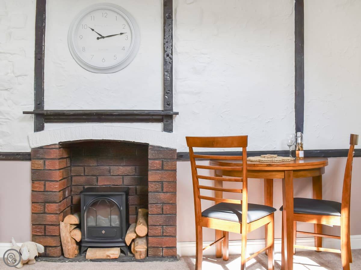 The cottage is from the 1700s, so you get the low beams. Mind your head. The stairs are steep. There's an electric stove in the front room that gives a bit of heat and looks nice.