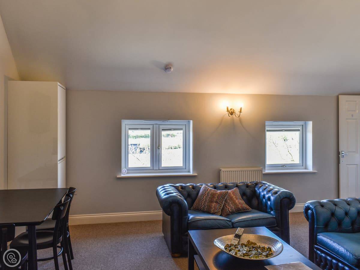 The main room is open plan. There's a kitchen area with a dishwasher, a table to eat at, and a sitting area with a TV. The windows look out over the fields. It's a quiet spot.