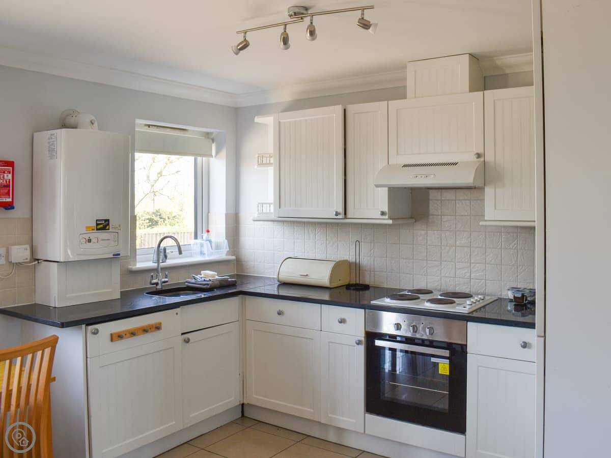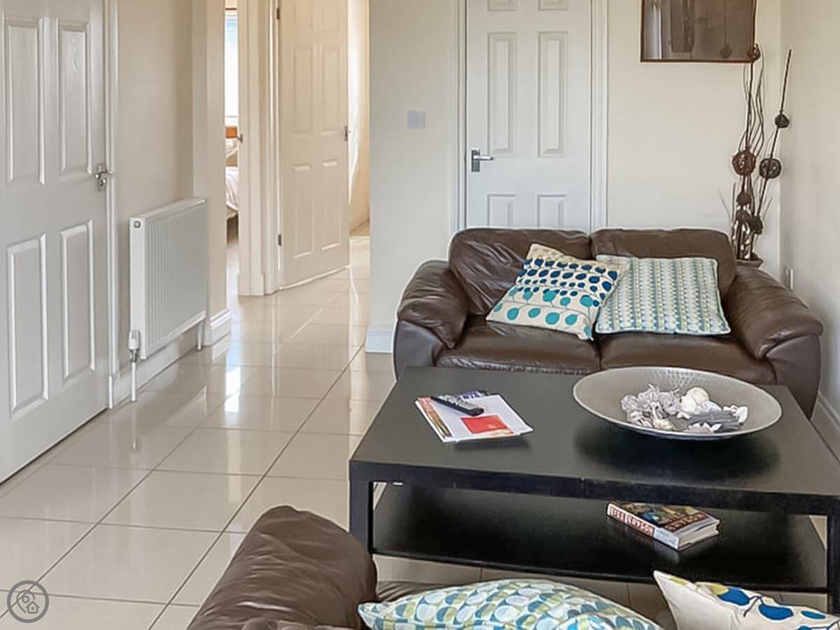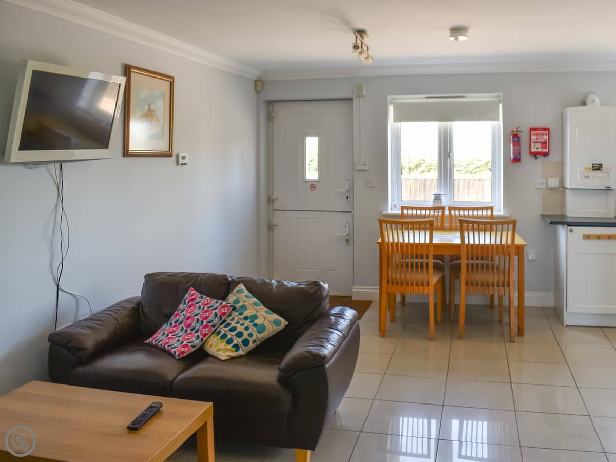 It’s open plan inside. The kitchen is at one end, living space in the middle, and the dining table is by the big window. That window looks out over the fields. You get the best of the afternoon sun there.