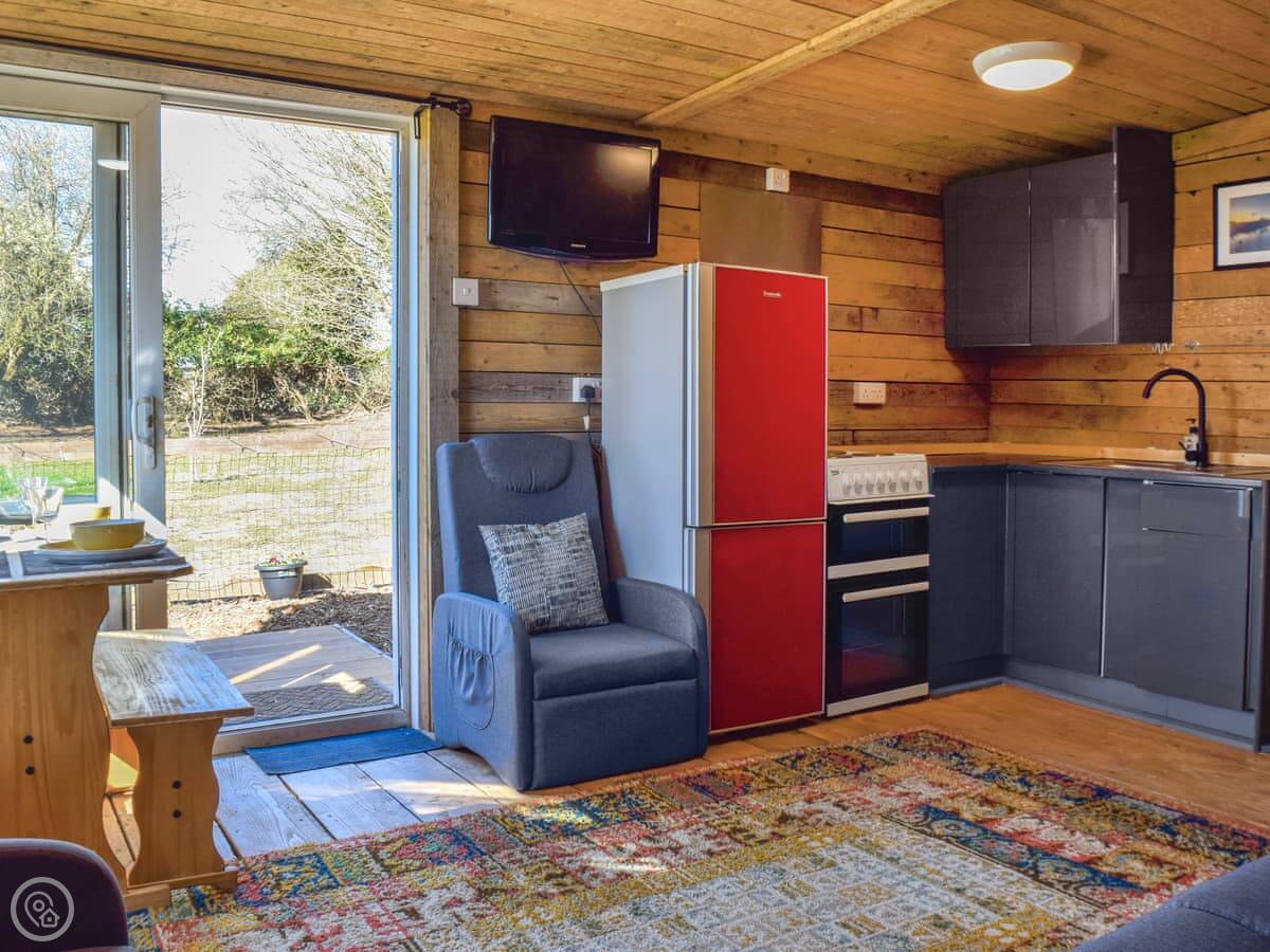 The inside is one open plan room with a kitchen and living area. The floorboards are reclaimed wood, same with the walls. It feels rustic. It's heated with electric heaters in each room. There are patio doors at the front and the back, so it's light. One opens to an enclosed seating area outside.