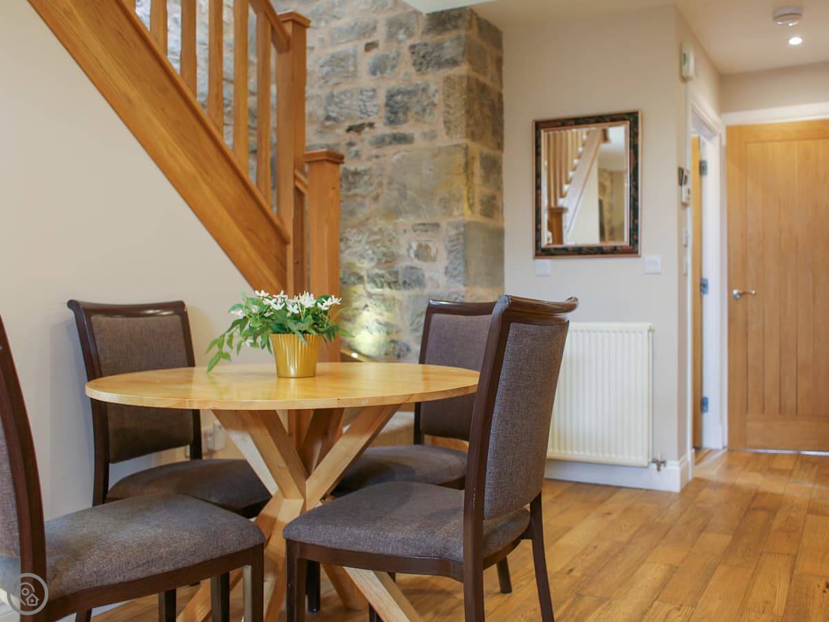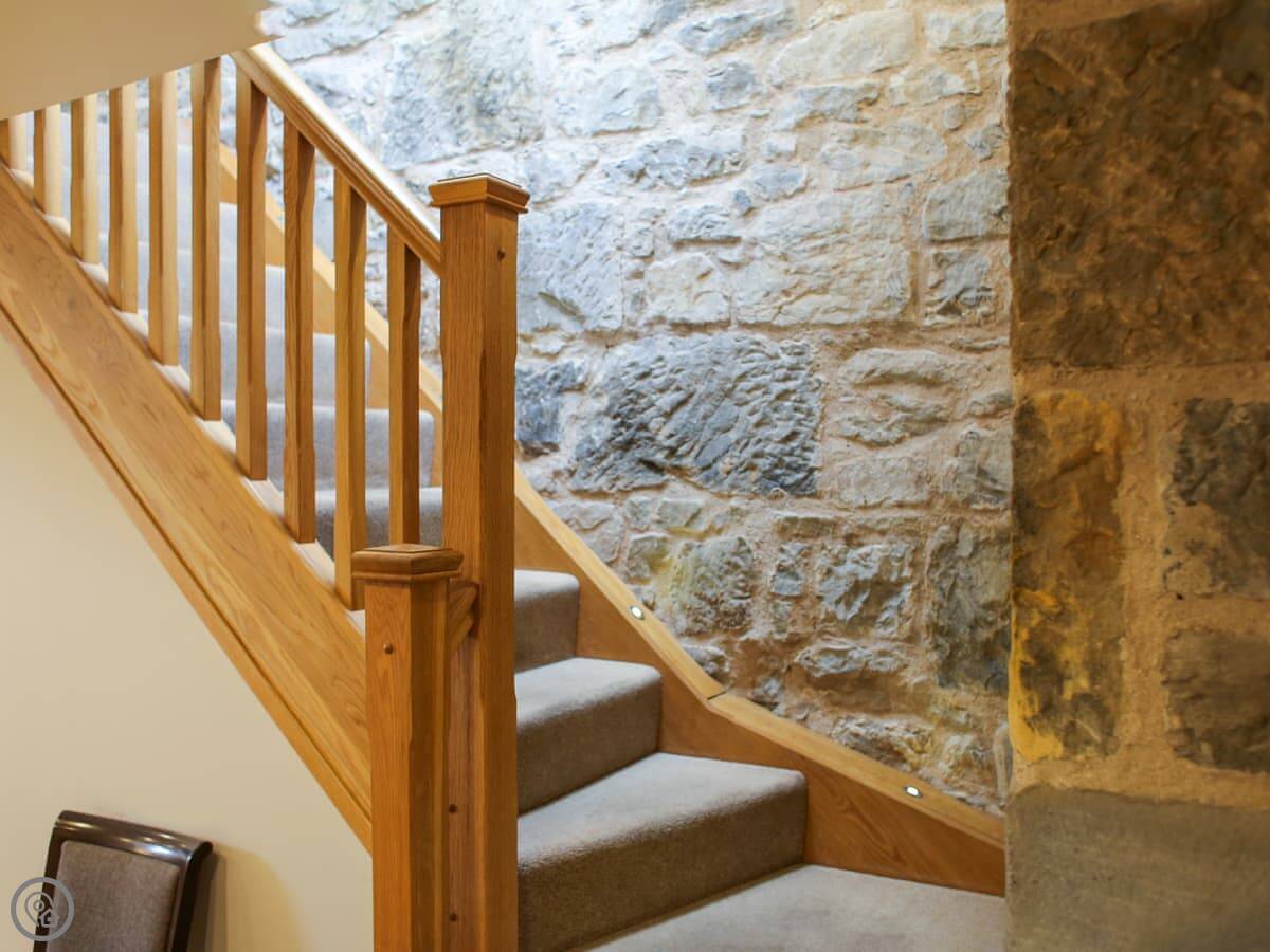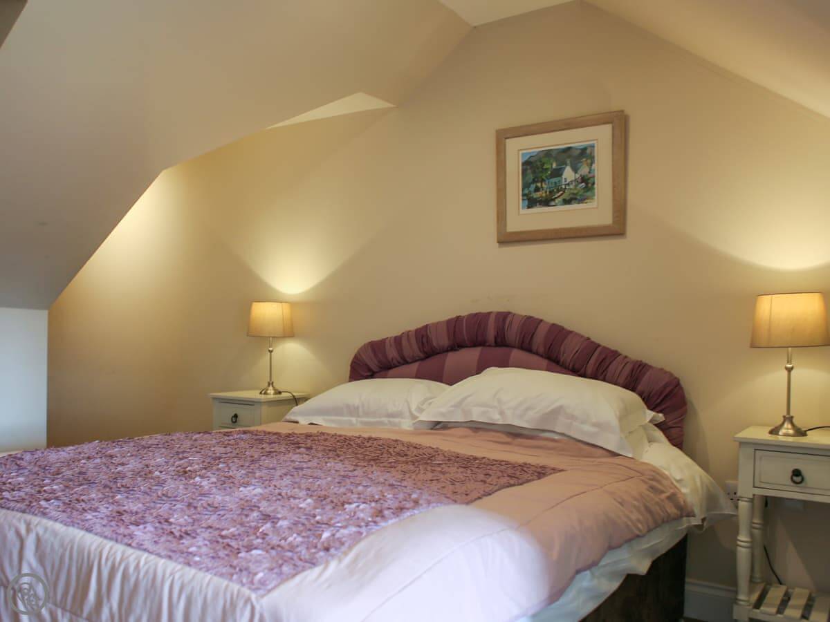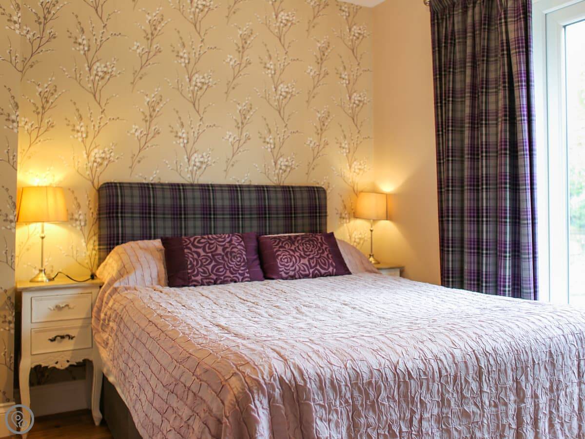 There are two bedrooms and two bathrooms. One bedroom is on the ground floor with patio doors to the garden. The other is upstairs and has a bath en suite. It's got a 4 Star rating, so it's well looked after and comfortable. It's not huge, but it's fine for four people. The stairs are a typical cottage staircase, so they turn a bit and are a bit steeper than a normal house.