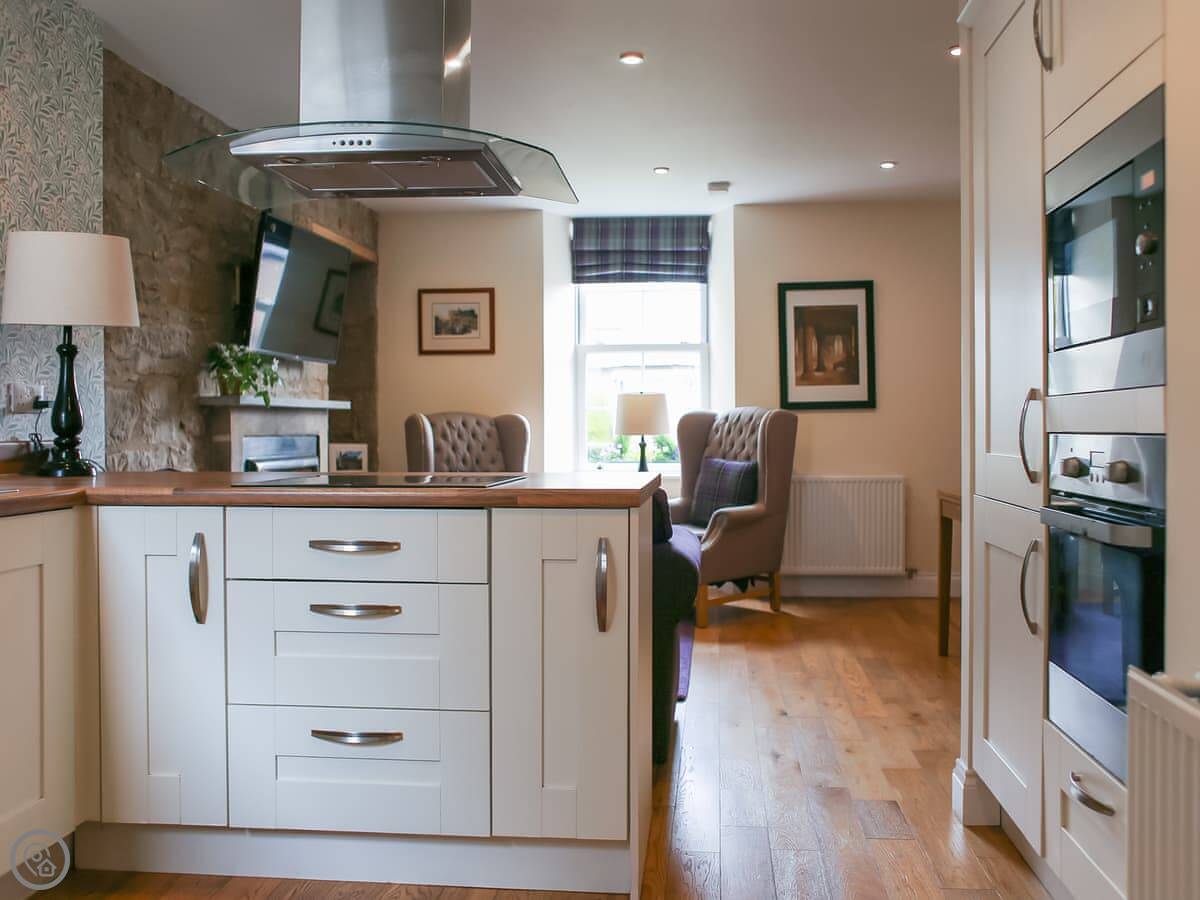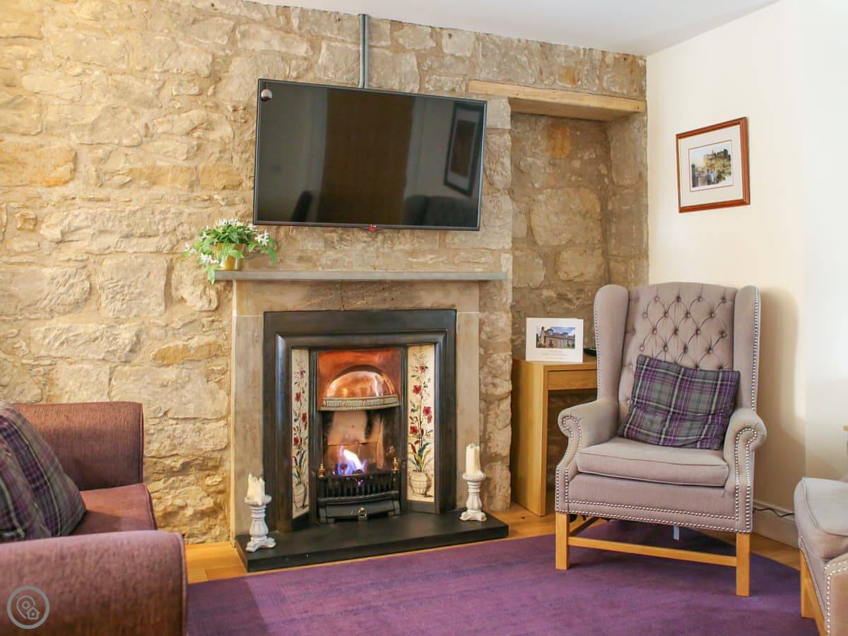 Inside, it's got the original stone walls. There's a gas fire in the living room that looks like a real fire. The kitchen is fine, it has a dishwasher. There's a washing machine, WiFi, TV, and parking right outside.