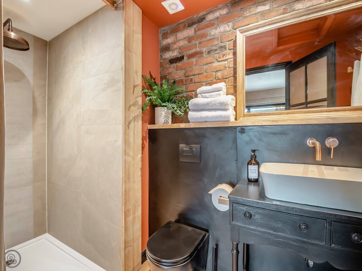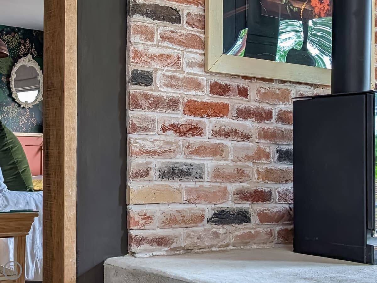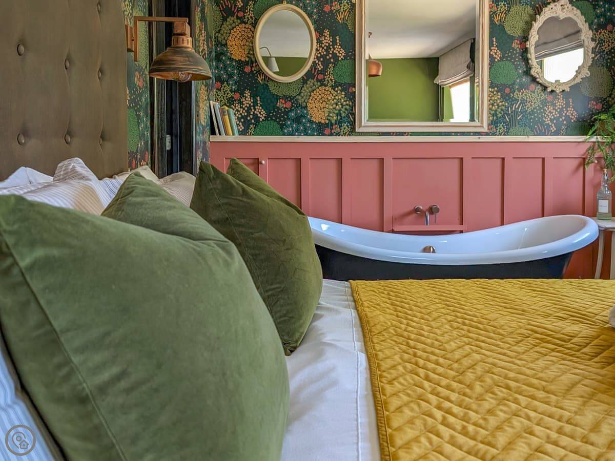 The main room is open plan. There's a wood burner. The bed is in the same space as the living area. The bath is in the bedroom too. It's a feature bath. We provide dressing gowns.