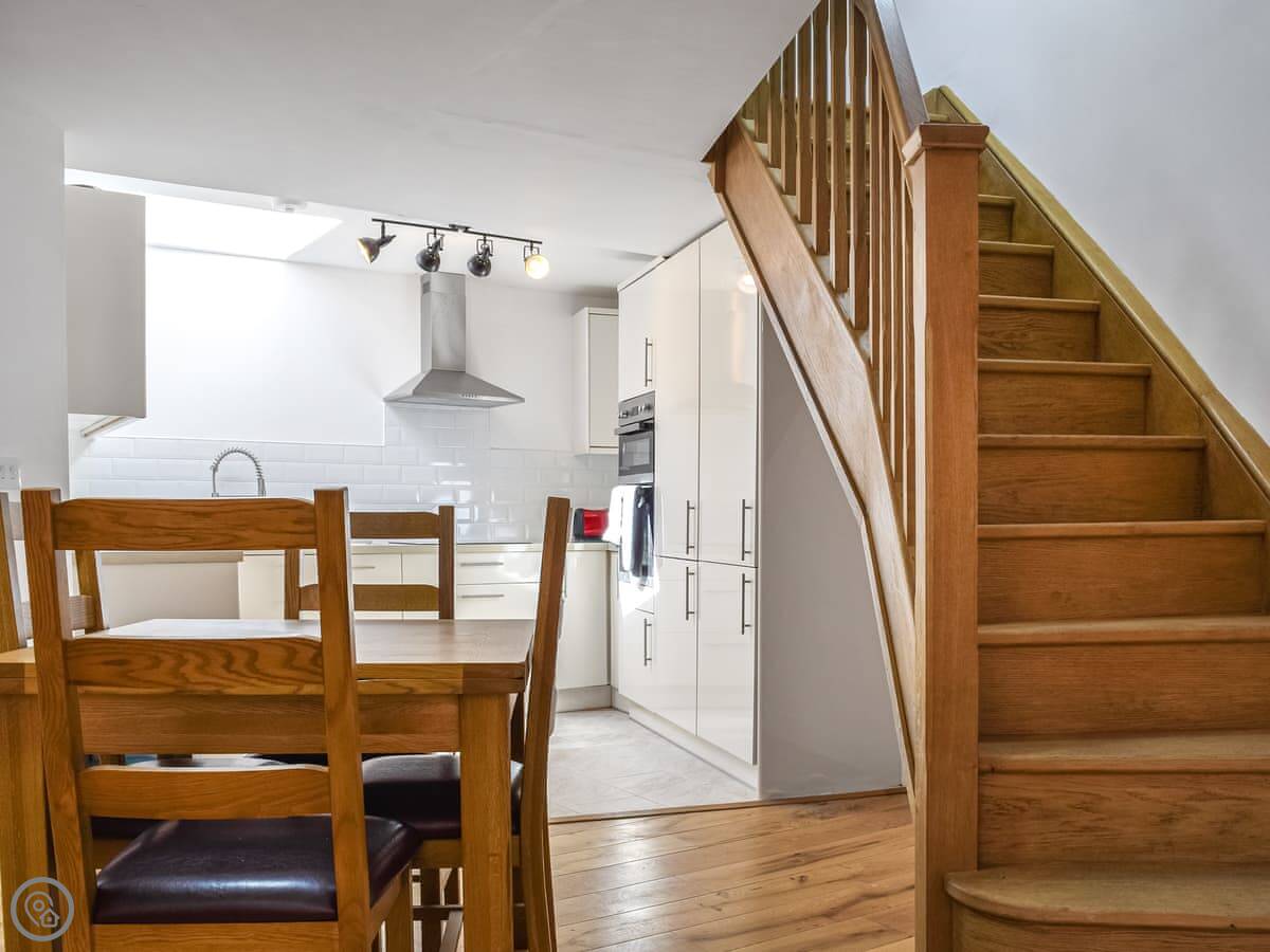 Downstairs is open plan. Kitchen, dining table, and sitting area all in one room. It works well. The stairs are a bit steep and narrow, just so you know.
