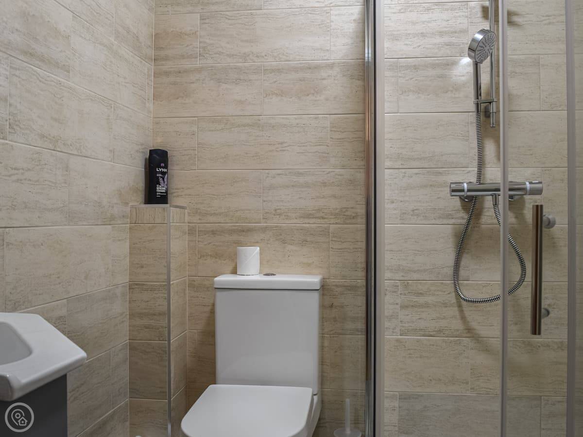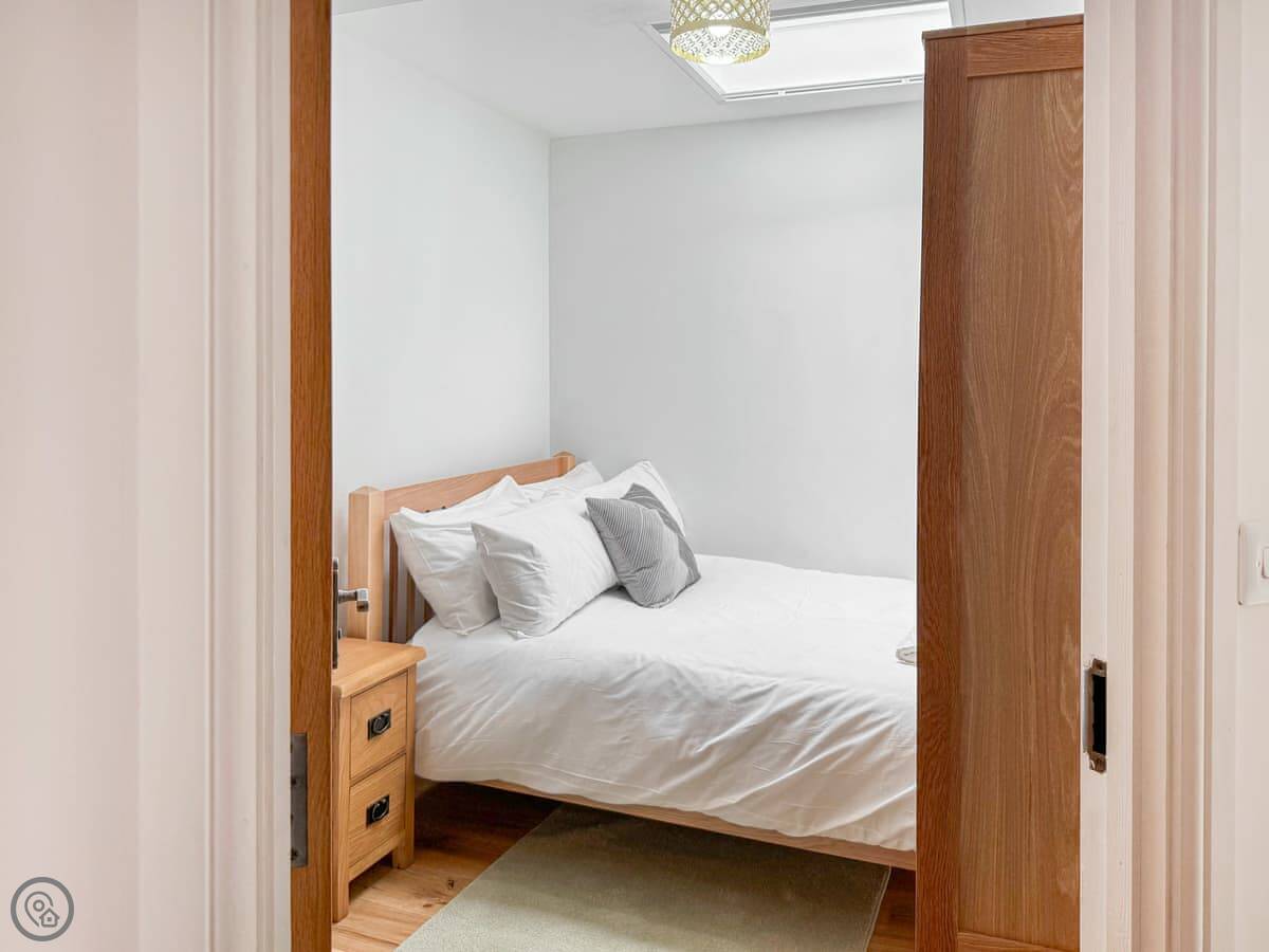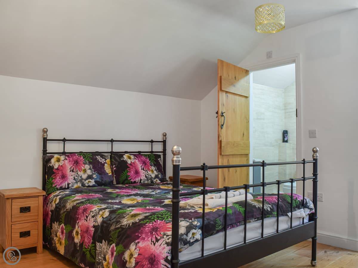 It sleeps four. Two bedrooms, both with their own bathroom. One is on the ground floor with a double bed. The main bedroom is upstairs and has a king-size bed. It's got a 4 Star rating.