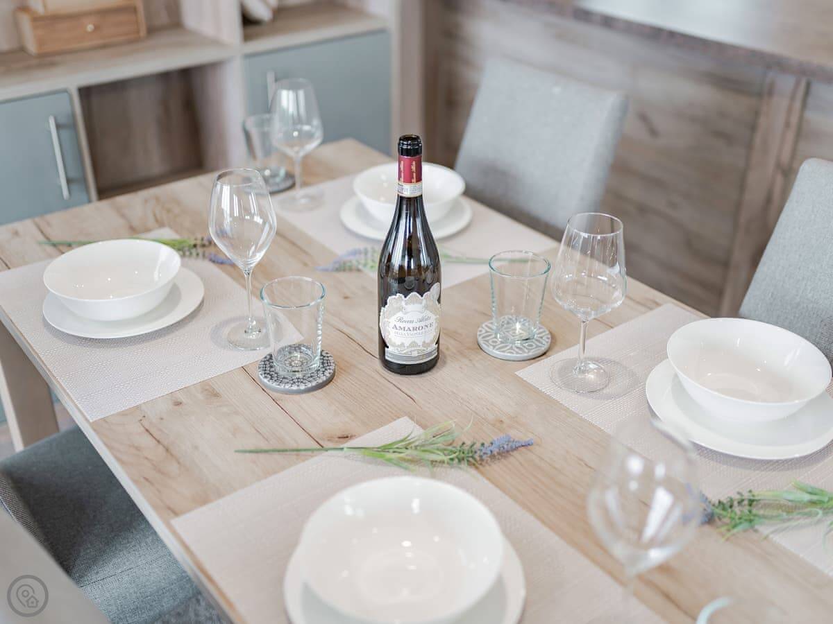 The living space is all open plan. Big windows so you can see the water. There's a proper kitchen with a dishwasher and washing machine. The deck has seating out there.