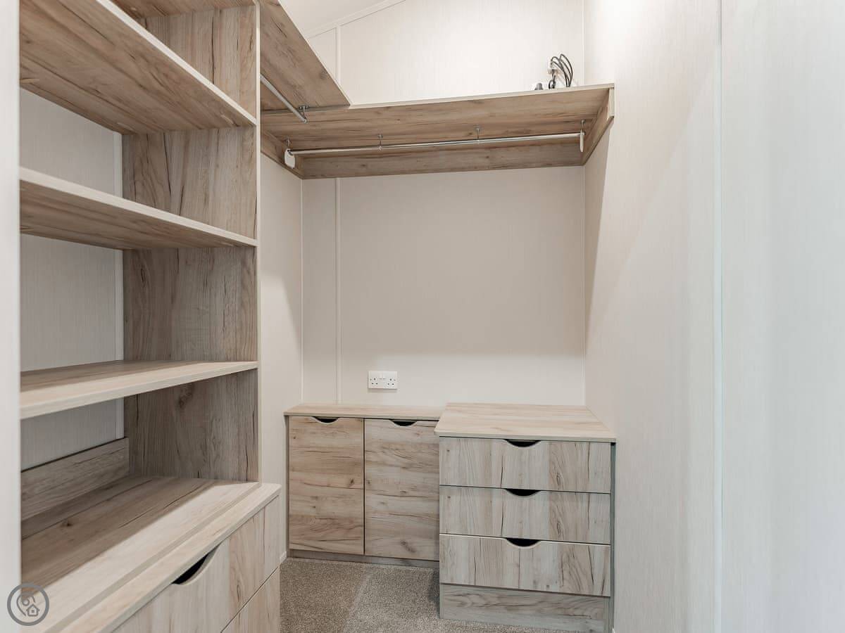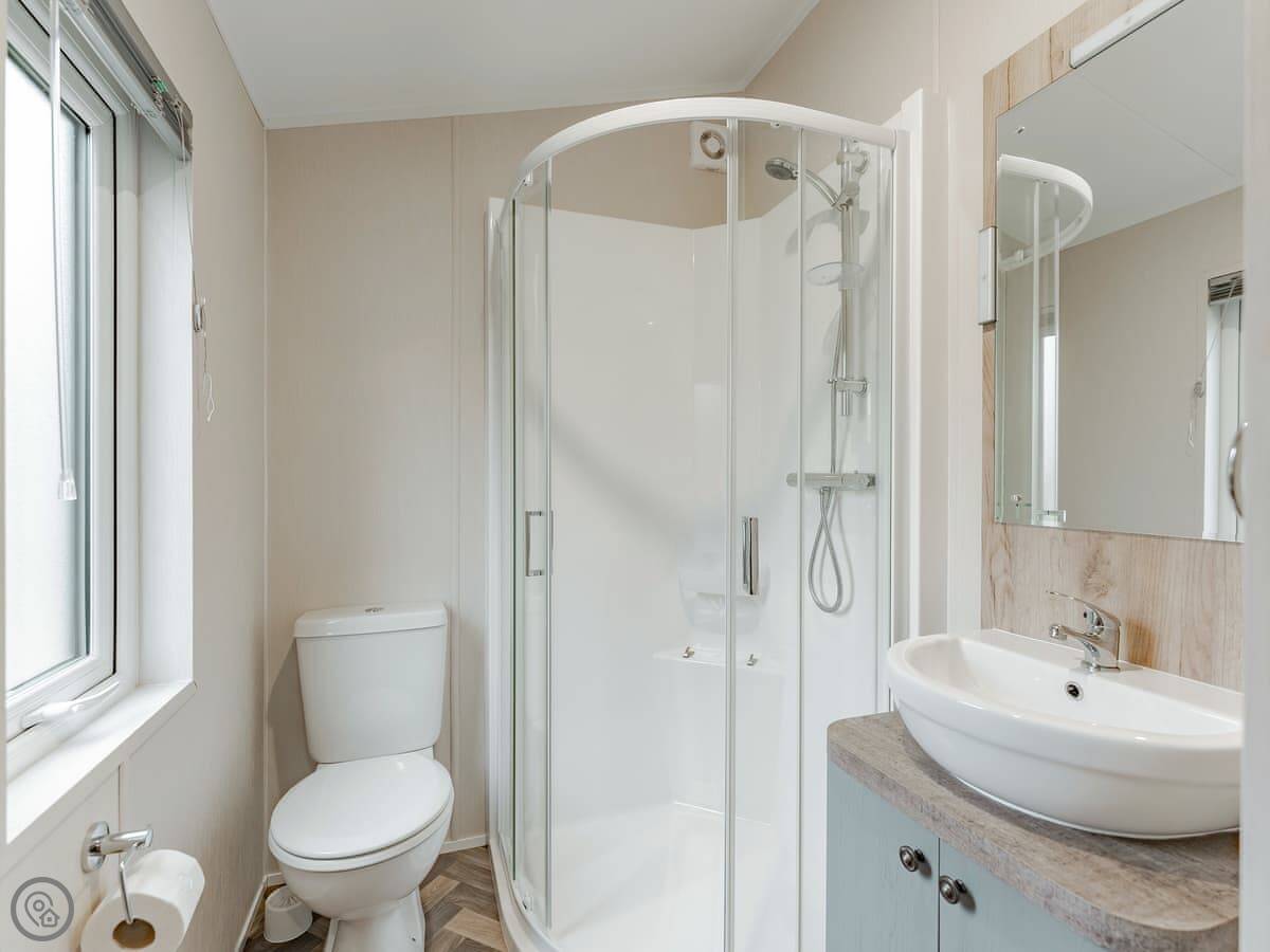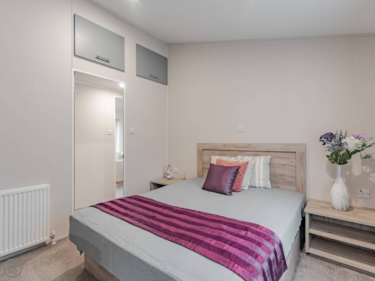 It sleeps four. There are two bedrooms and two bathrooms. One's a double with its own shower room, the other has twin beds. They both have walk-in wardrobes. It's got a 4 Star rating. Everything's clean and in good order.