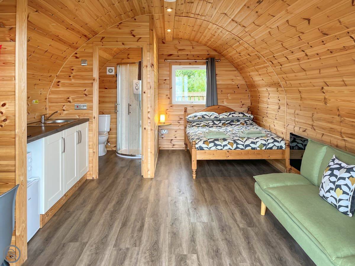 It's for two people. One room, with a double bed, and a shower room. Everything's open plan. It's got a 3 Star rating, so it's comfortable and clean. There's a small kitchen area, a TV, and WiFi. Bedding and towels are included. You can bring one dog.
