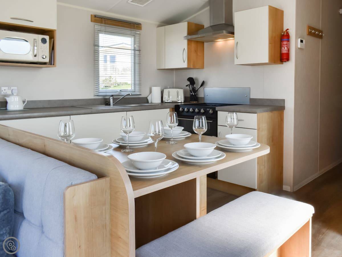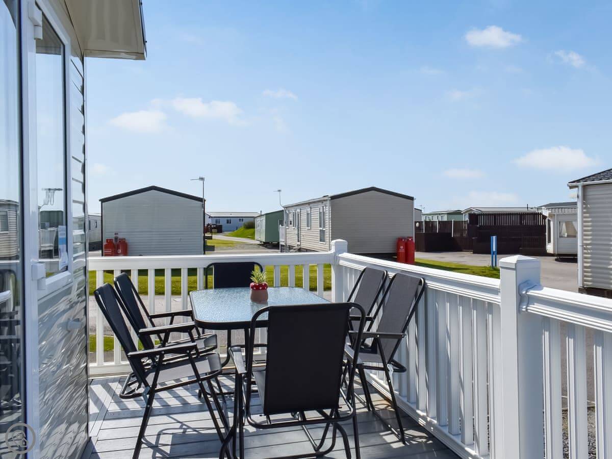 It's got a 4 Star rating. That means it's well-equipped and modern. It's open plan inside. The French doors open out onto a big deck with furniture. The view is over the park towards the sea. You get good sunsets over Morecambe Bay.