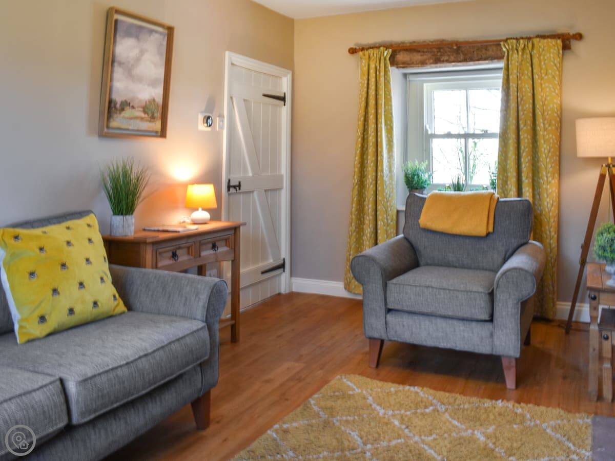You come in through a little front garden with a low wall. There are a few stone steps up to the door. Inside, the kitchen has a Belfast sink and tiles on the floor. It's got what you need. The living room has a wood burner. There's a TV and the wifi is decent.