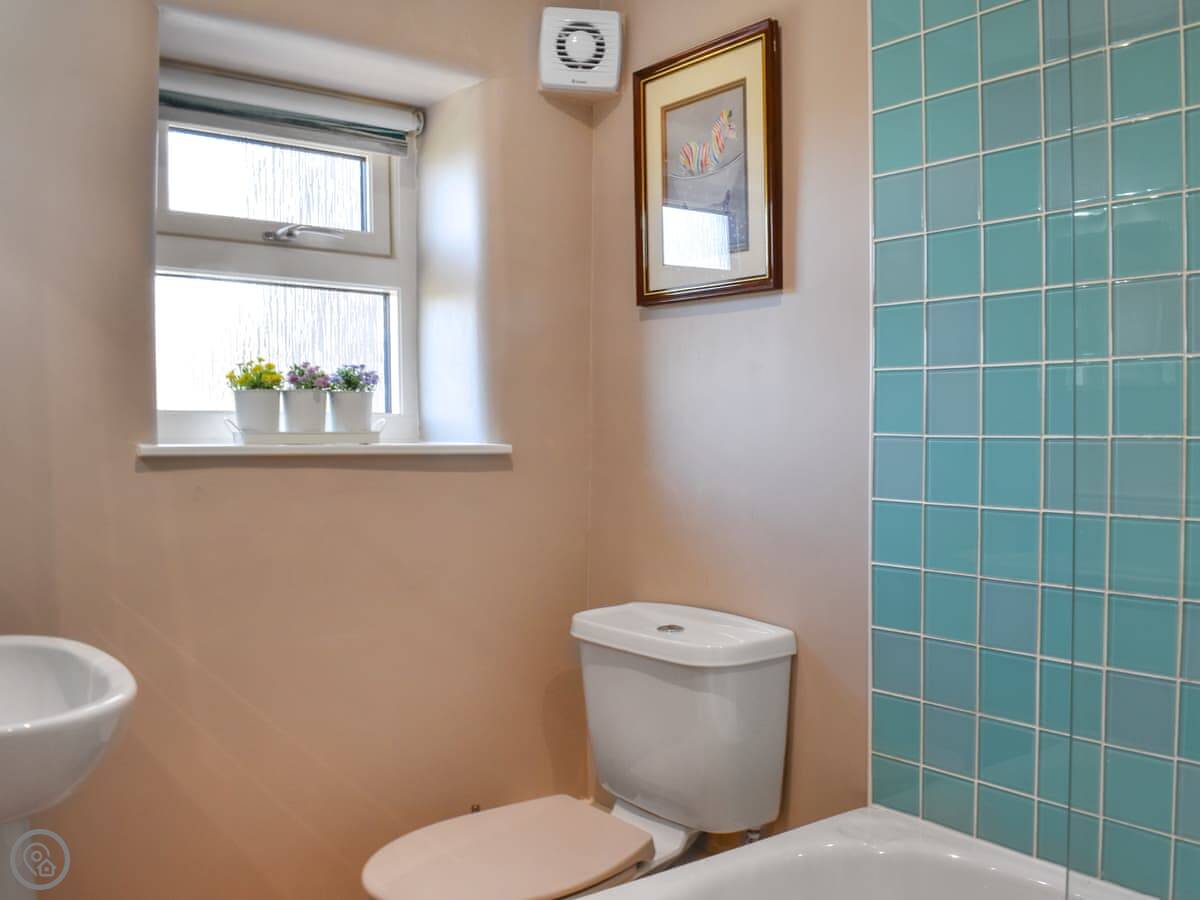 Upstairs there are two bedrooms. One has a double bed, the other a single. Both have beams, so mind your head if you're tall. One bathroom, with a shower over the bath.