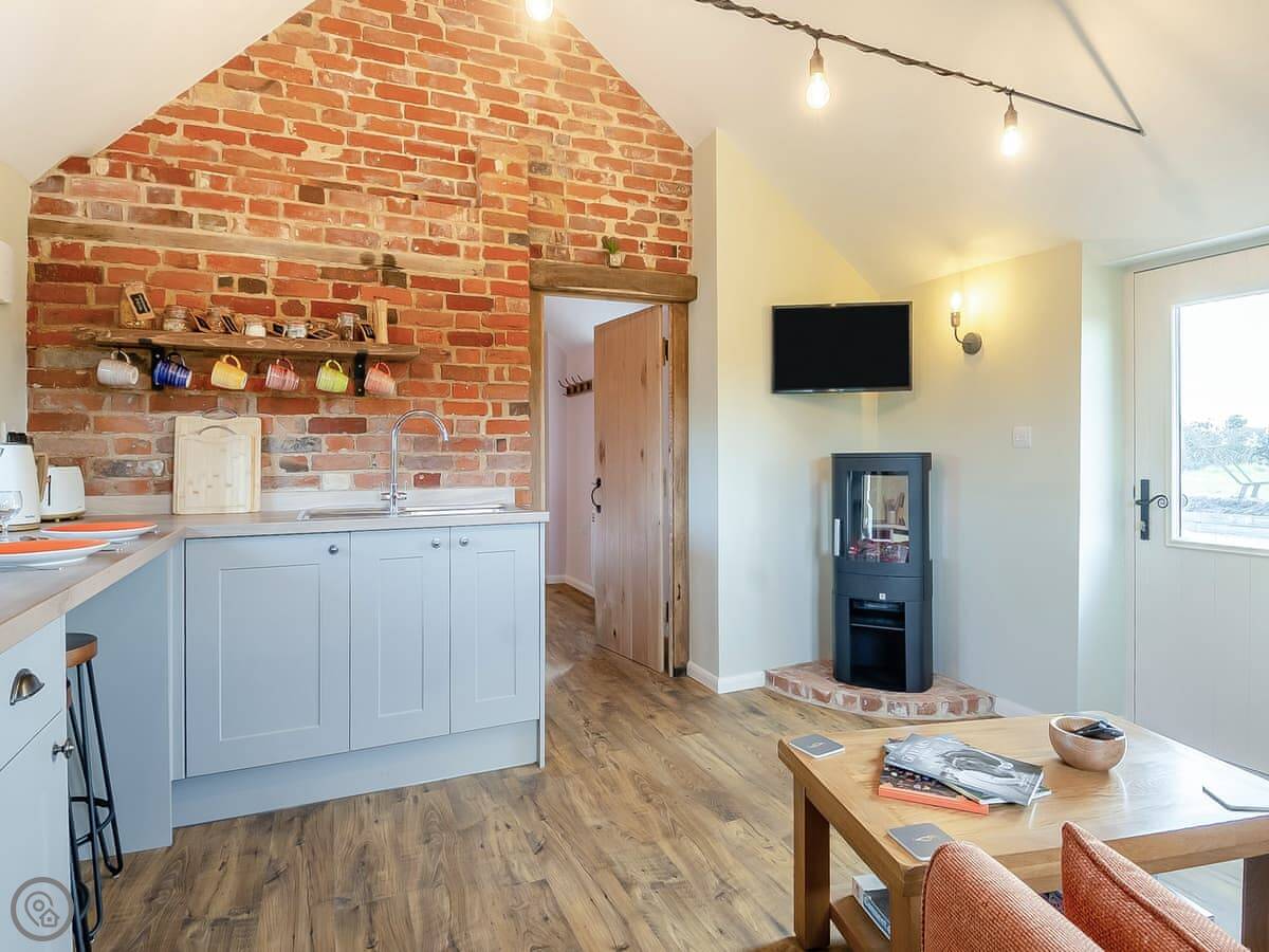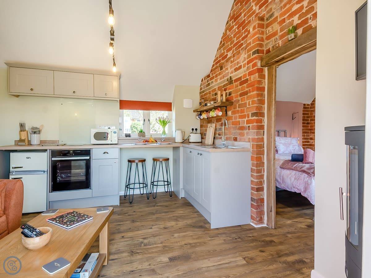 It's open plan inside. There's underfloor heating, a wood effect electric stove, and a kitchen area with what you'd need. The bedroom has a king size bed. The bathroom has a shower. Outside there's a private patio garden and parking for one car. There's also an electric vehicle charger.