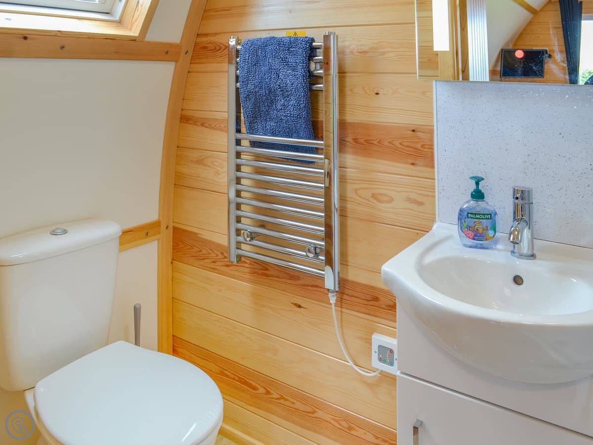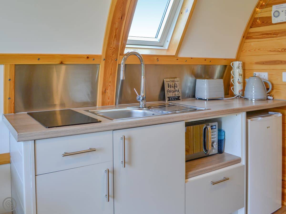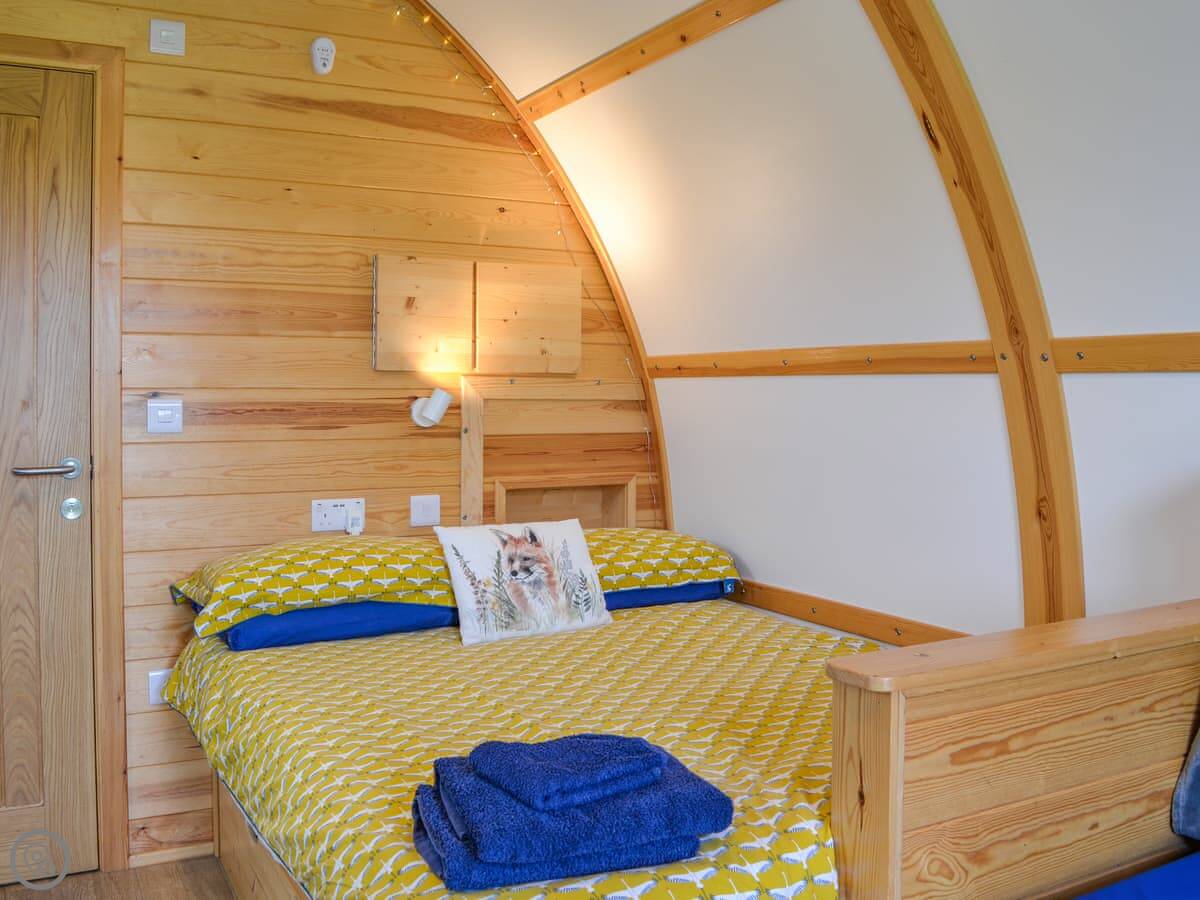 It's a pod, so it's all one room. You've got the double bed, a small sofa, a table, and a kitchen area with what you need. There's a shower room. It's 4 Star rated, which means it's comfortable and well finished.