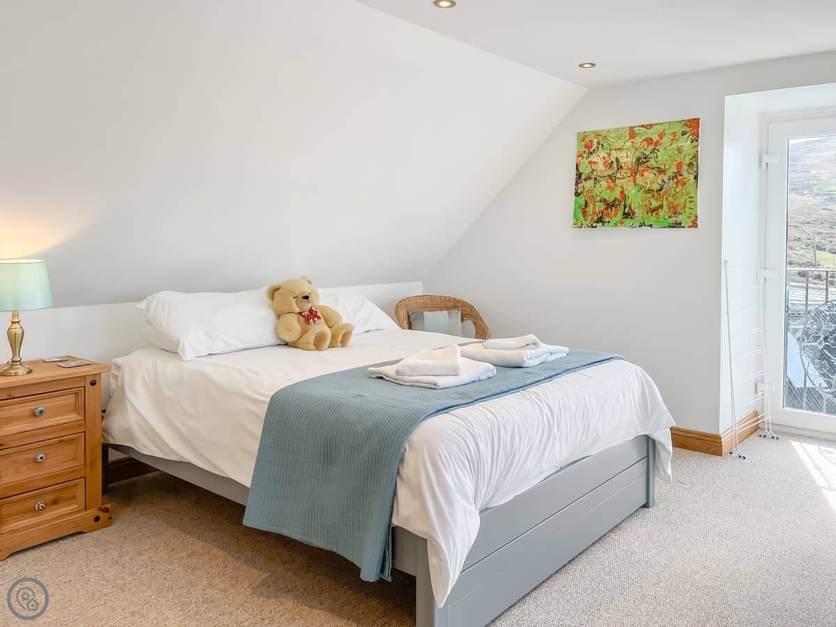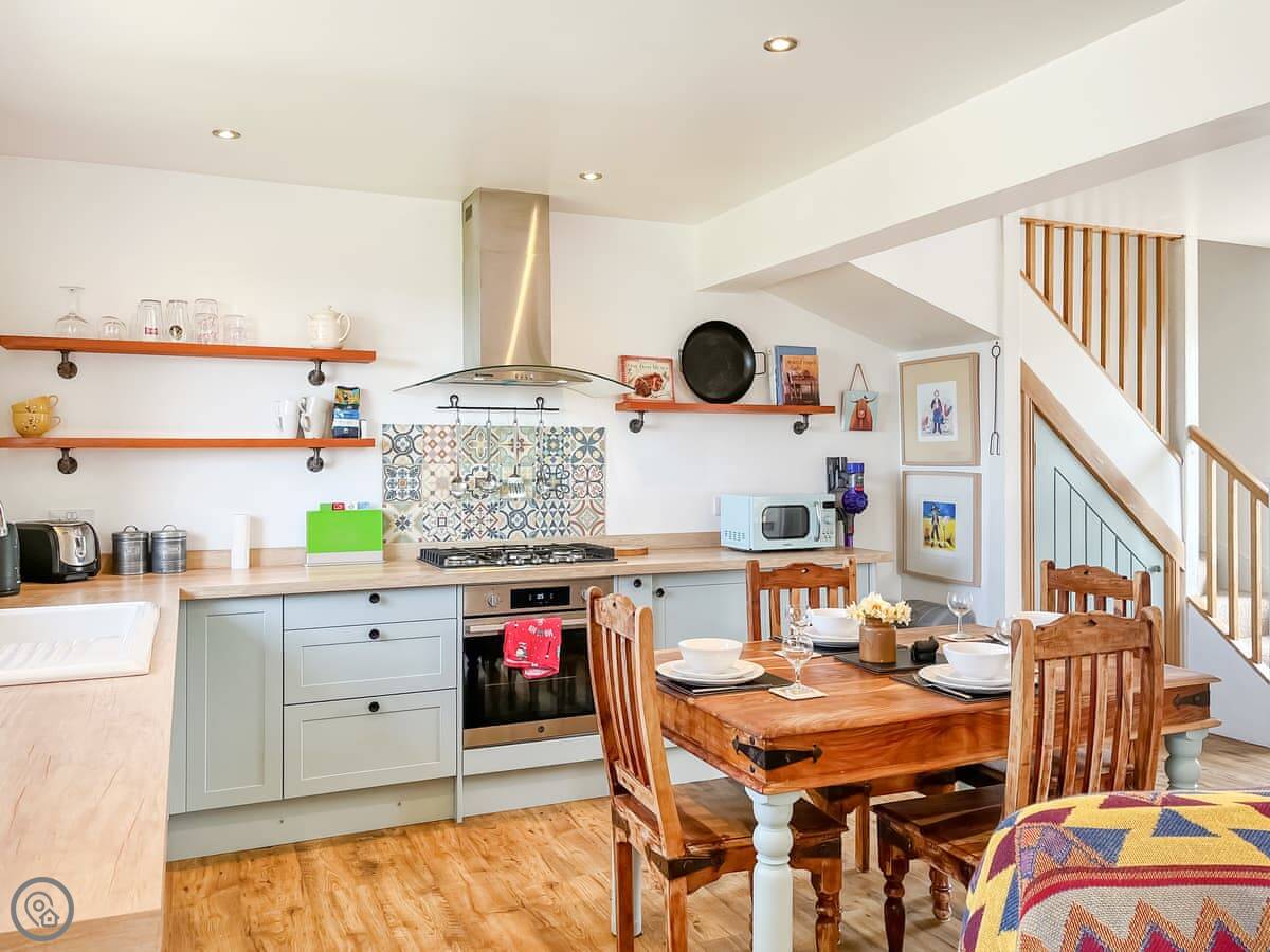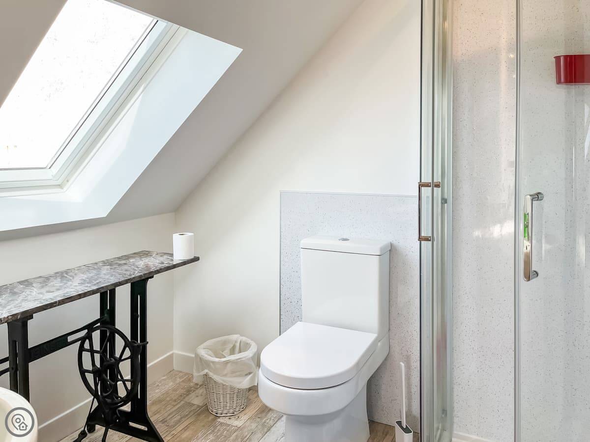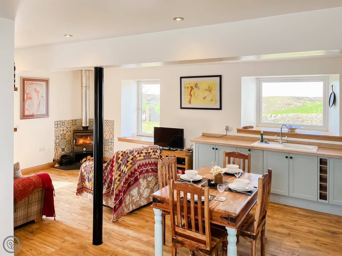 It sleeps two in one double bedroom. There's a shower room upstairs and a separate toilet downstairs. It's got a 4 Star rating. We keep it clean and comfy. The main room is open plan with a wood burner. We leave you some logs to get started.