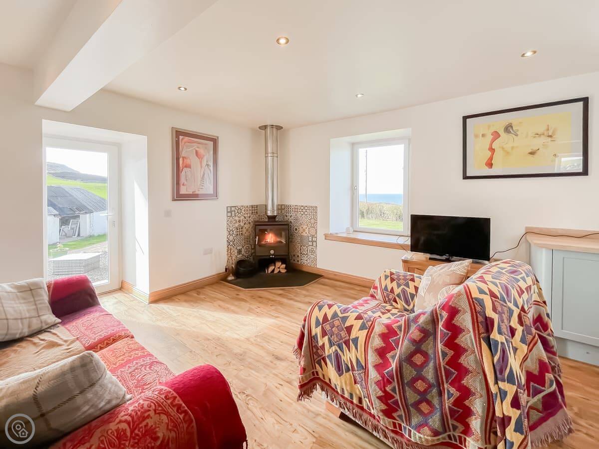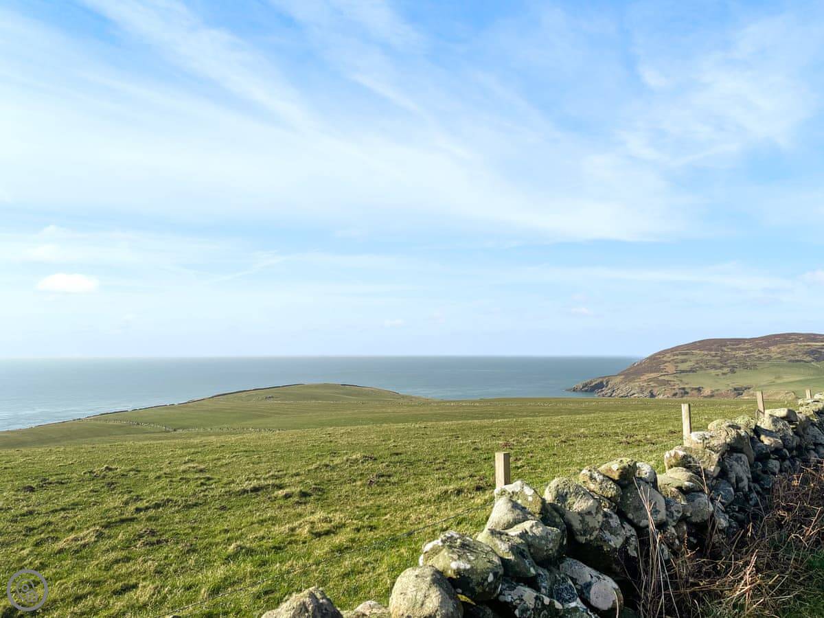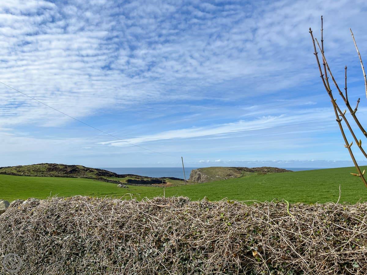 The view is the main thing. It looks south over our fields, then the cliffs and the sea. You can see the Mull of Galloway lighthouse from the window on a clear day. It's about a ten minute drive to get there. The Mull of Galloway has the lighthouse, a café, and the RSPB reserve. Drummore village is closer, maybe five minutes. It's got a shop, a pub, and a chip shop.