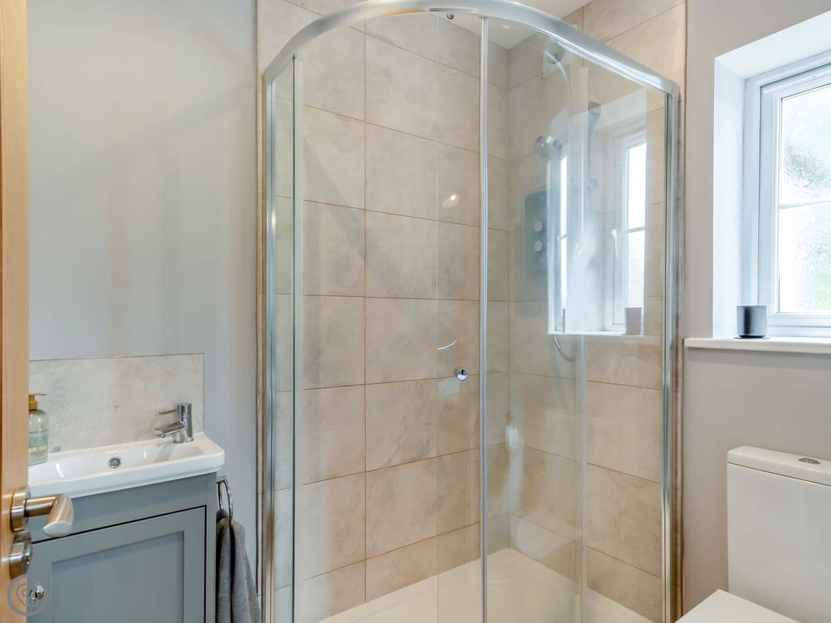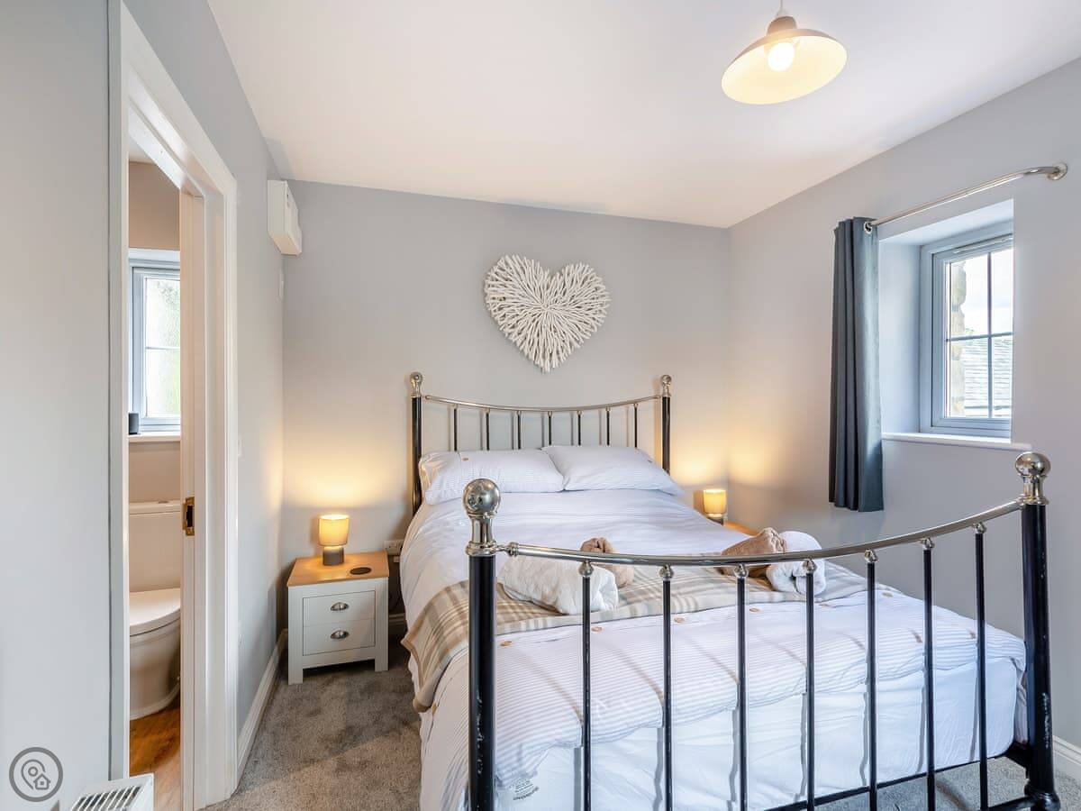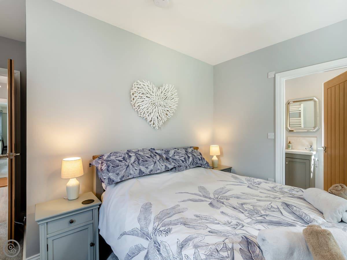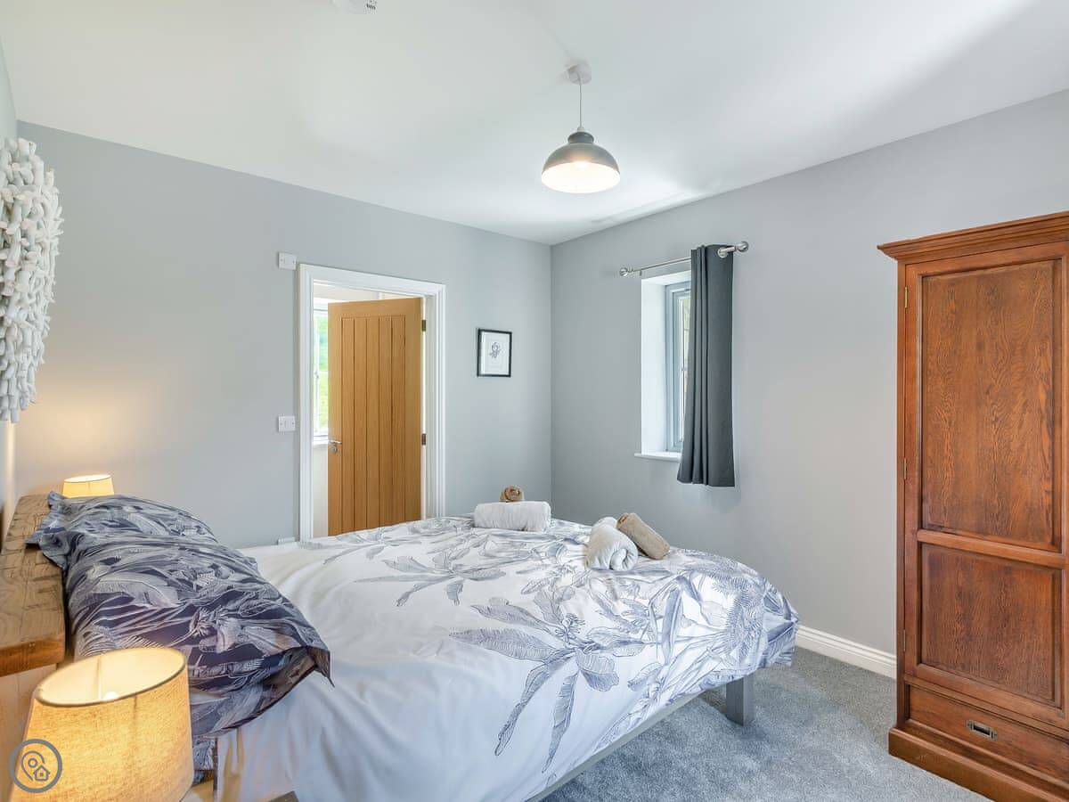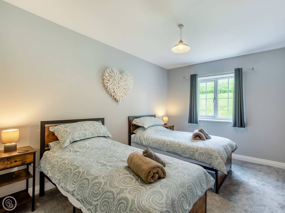 It sleeps six. Three bedrooms, and each one has its own bathroom. That’s probably the main thing. The living area is open plan, and there’s a wood burner. The French doors open onto a stone patio. The garden slopes away a bit, but there’s a nice flat bit to sit out on.