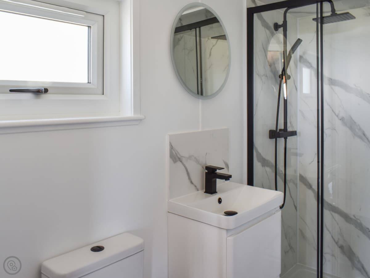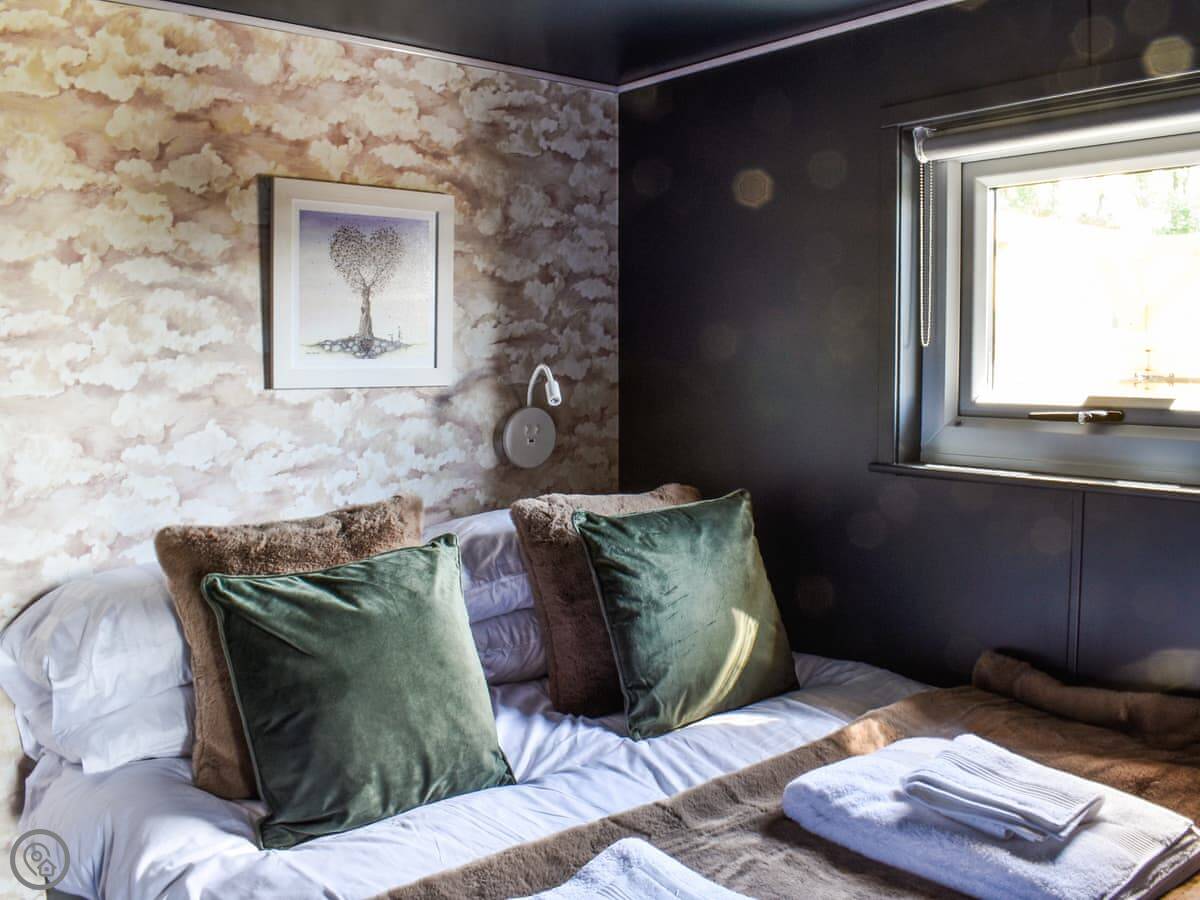 It sleeps four. There are two double beds. One is up a ladder on a mezzanine, so you need to be okay with climbing up and down. The other is on the ground floor, partitioned off from the living space. There's one shower room.