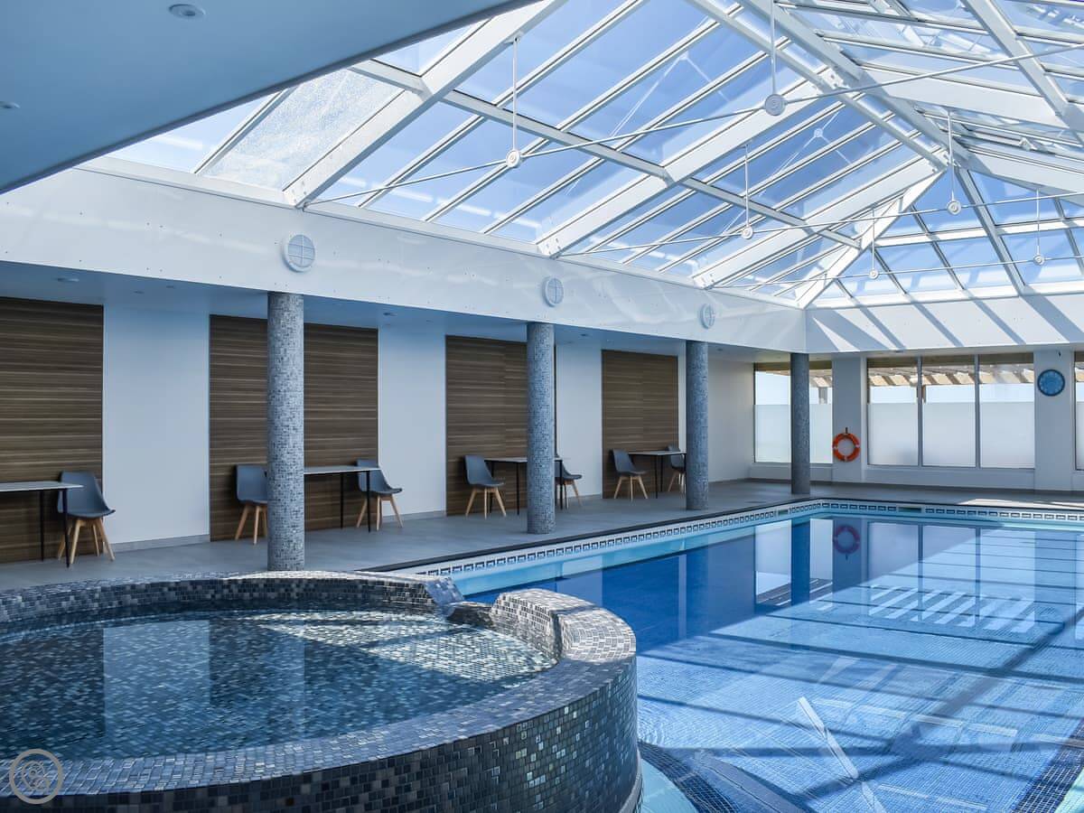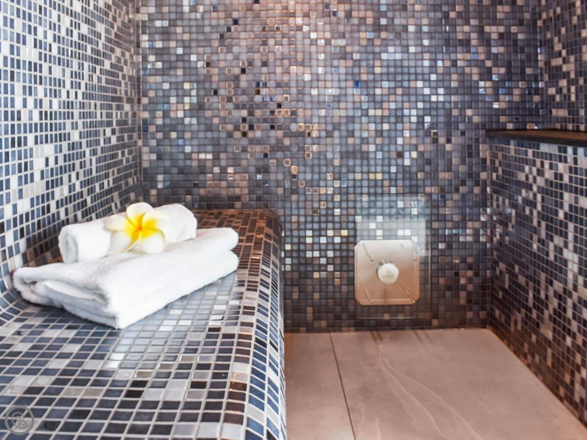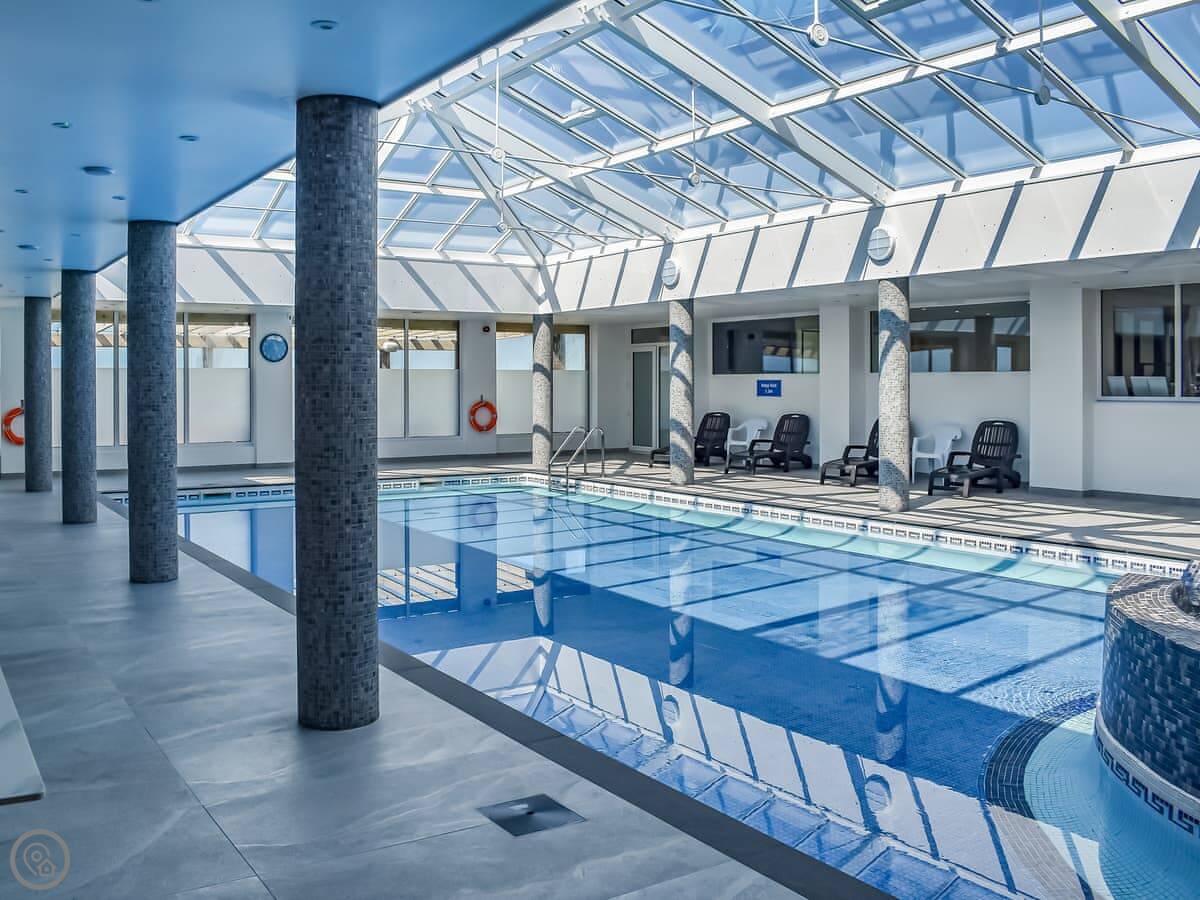 The holiday village has an indoor heated pool you can use, and a tennis court. There's also a bar and restaurant on site. These facilities are only open from Easter to the end of October.