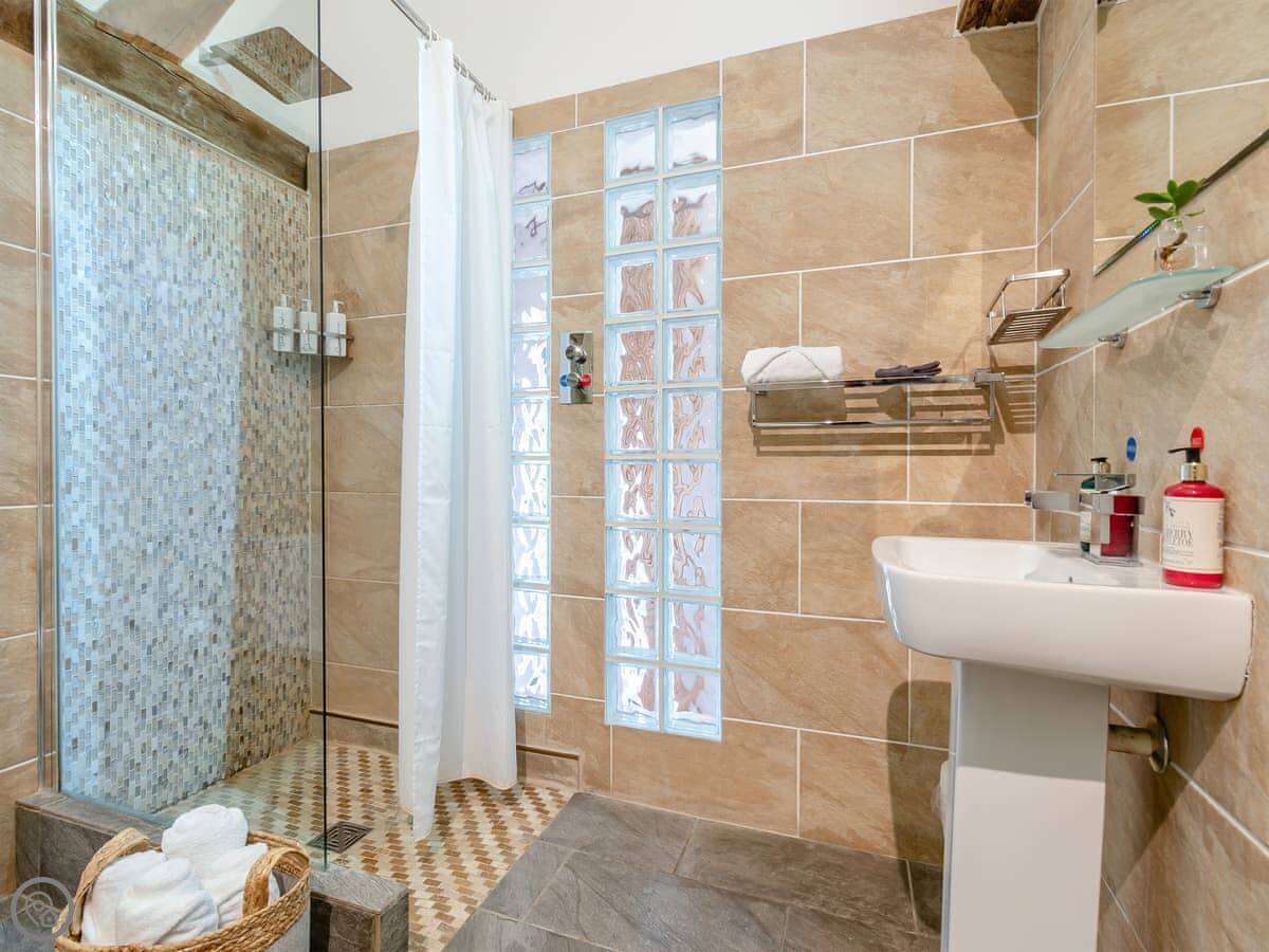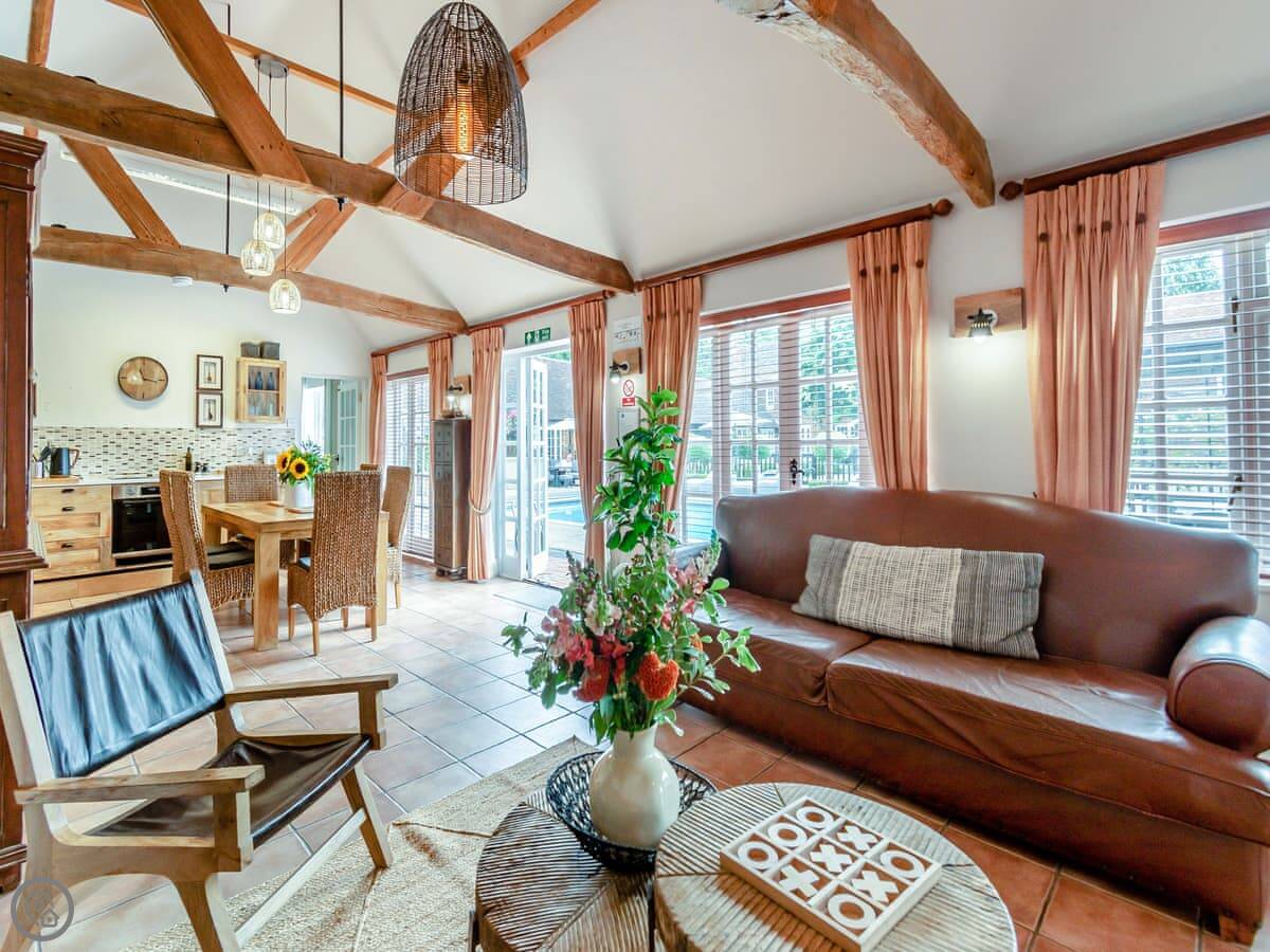It's got a 5 Star rating. That means it's well-finished and has good facilities. There are two bathrooms, which helps with eight people. The kitchen is open plan and has a dishwasher and a coffee machine. There's a laundry room you can use in the main building.
