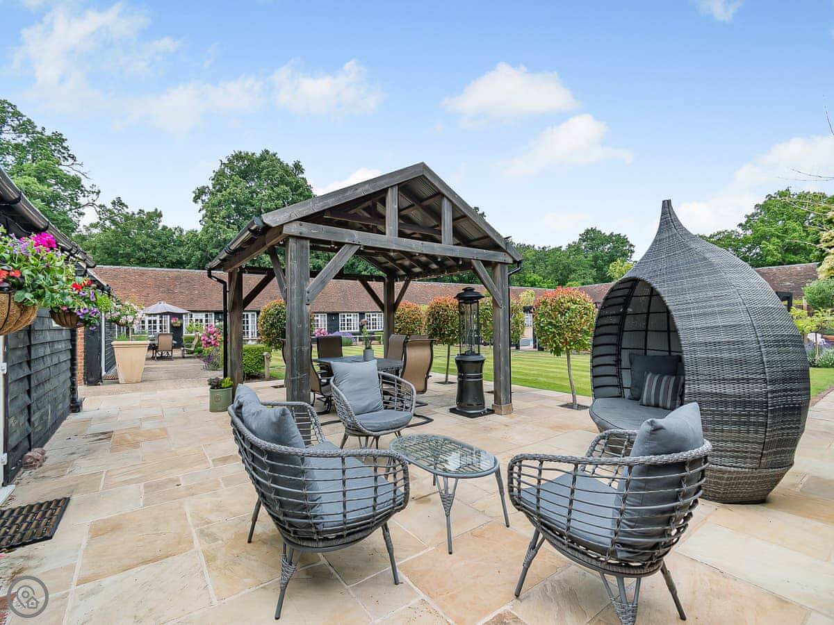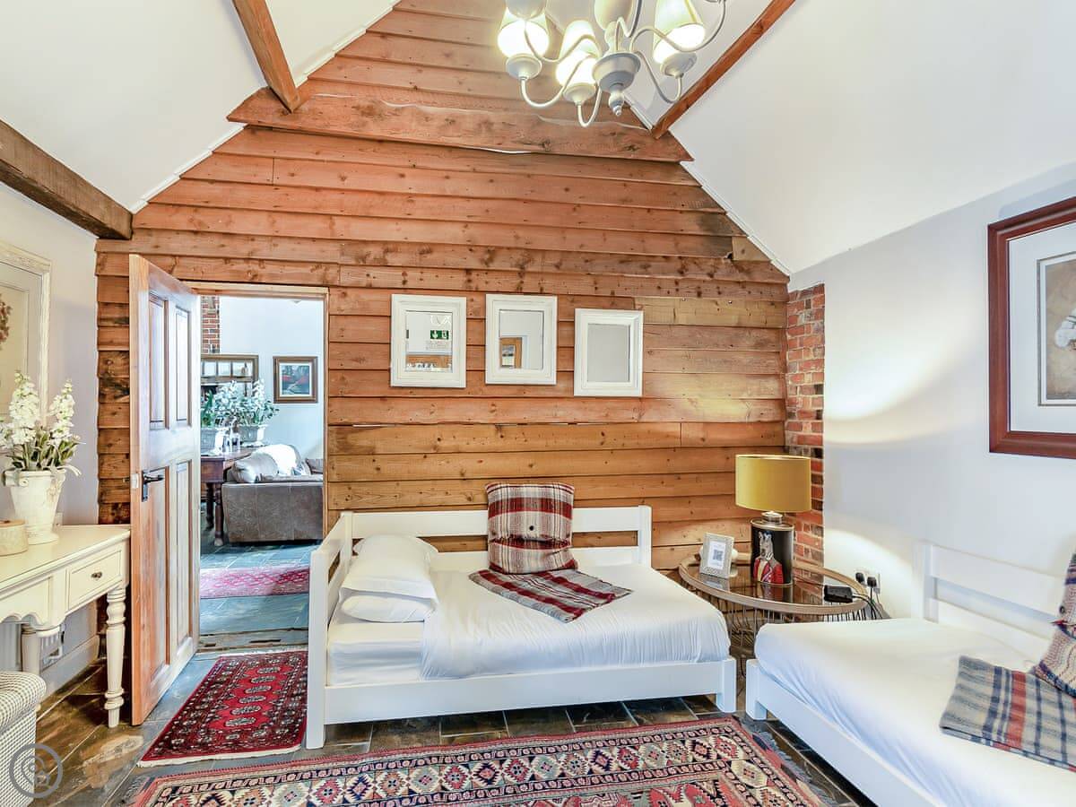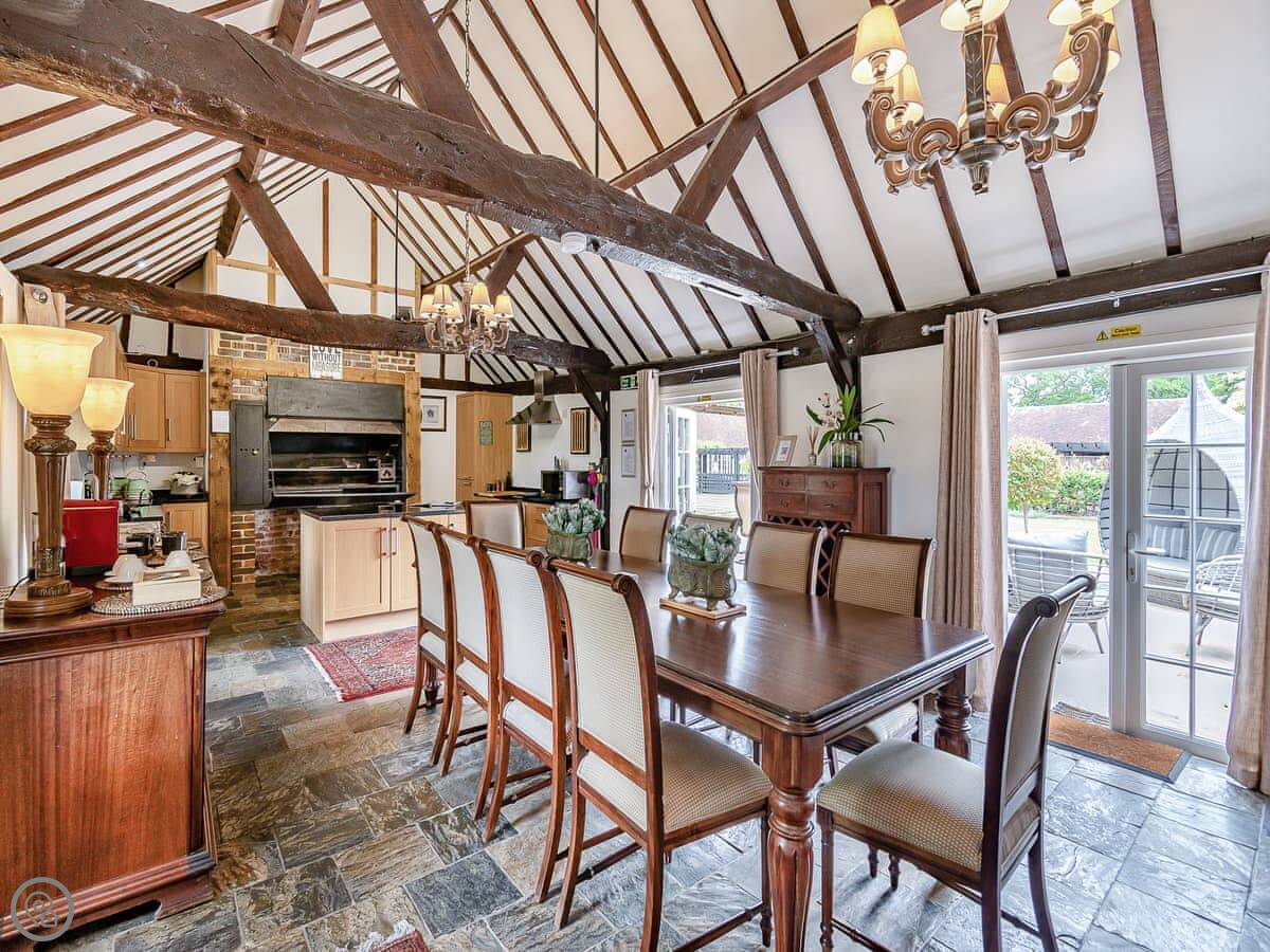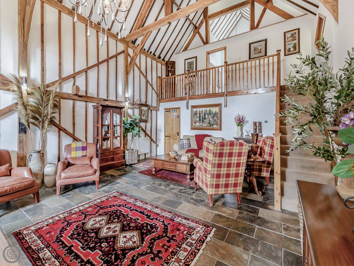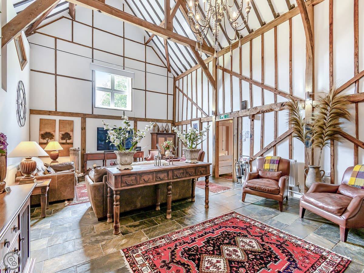 The Barn is on the edge of Sutton Green, near Woking. It's a converted barn, done up pretty modern inside. It sleeps eight but it's two bedrooms, so there are bunk beds and it's fairly open plan. It's a 5 Star, which means it's well kitted out and everything is new.