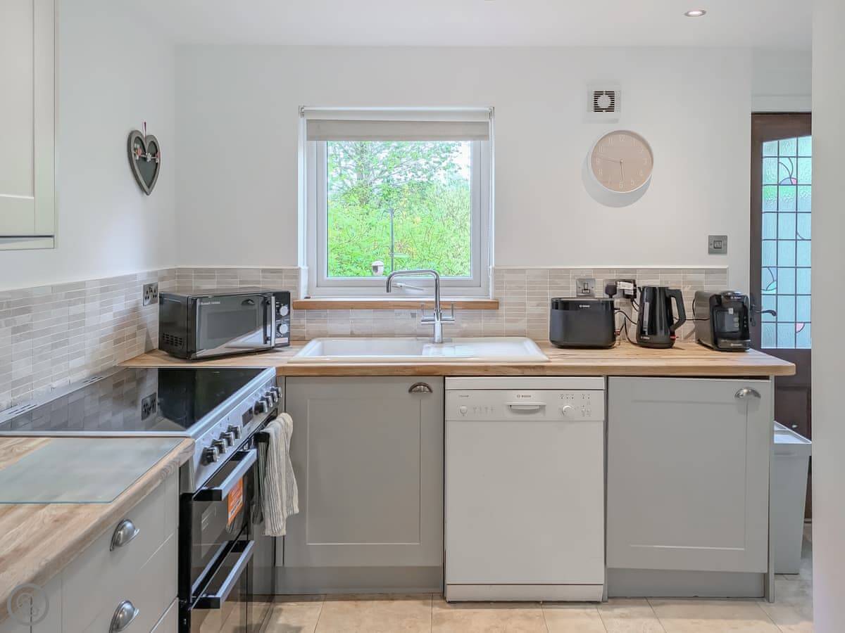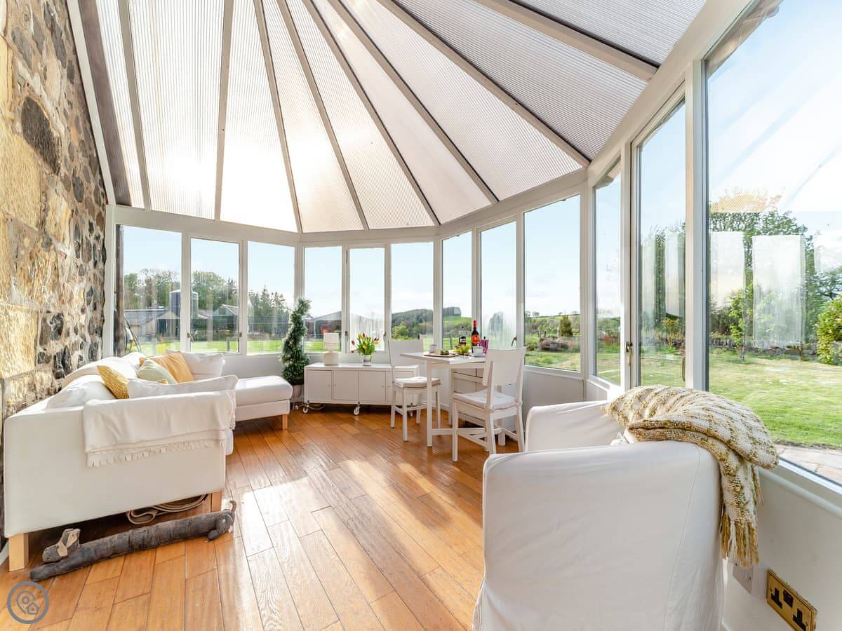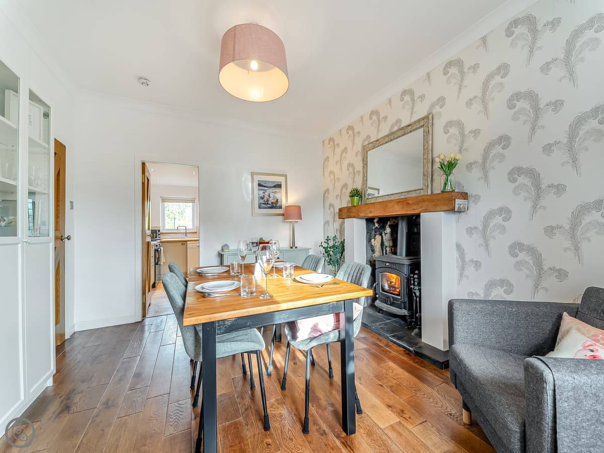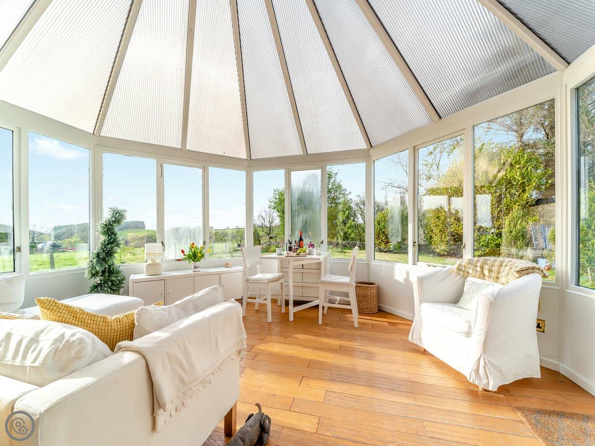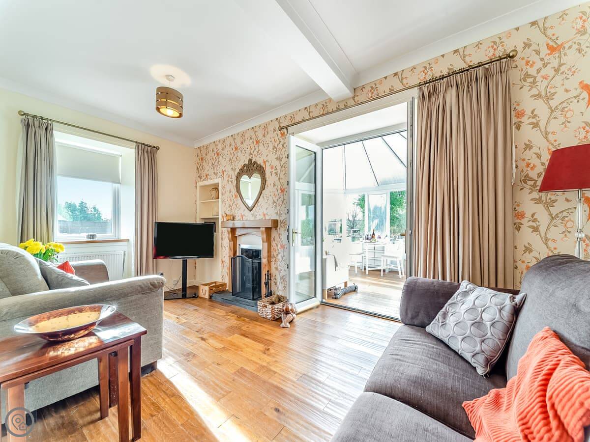 It sleeps four. Two bedrooms, one bathroom. It's got a 4 Star rating. It's comfortable, in very good condition. The layout is a bit different. You walk into the living room, then there's a small conservatory on the back that catches the evening sun. The kitchen is separate but leads through to a dining room with a stove.