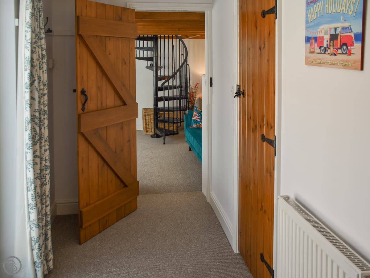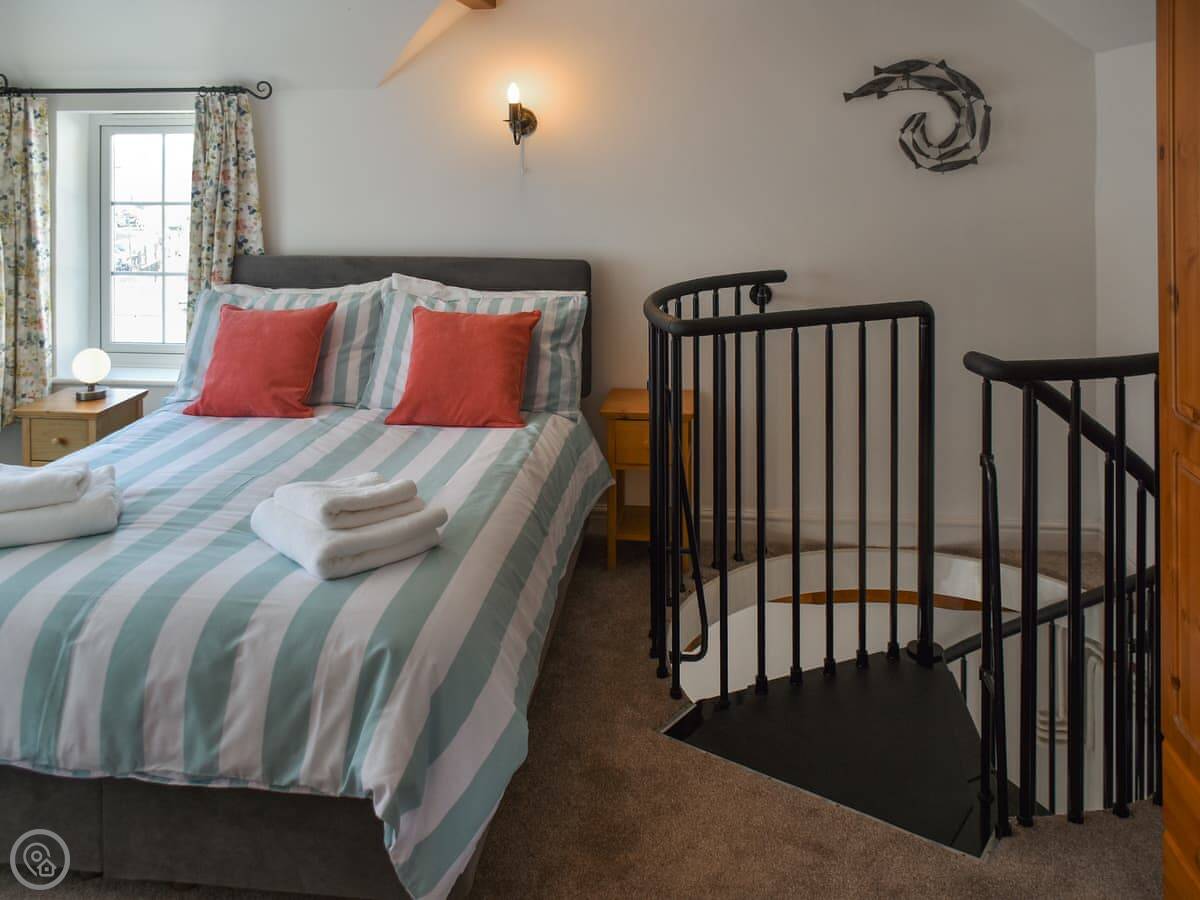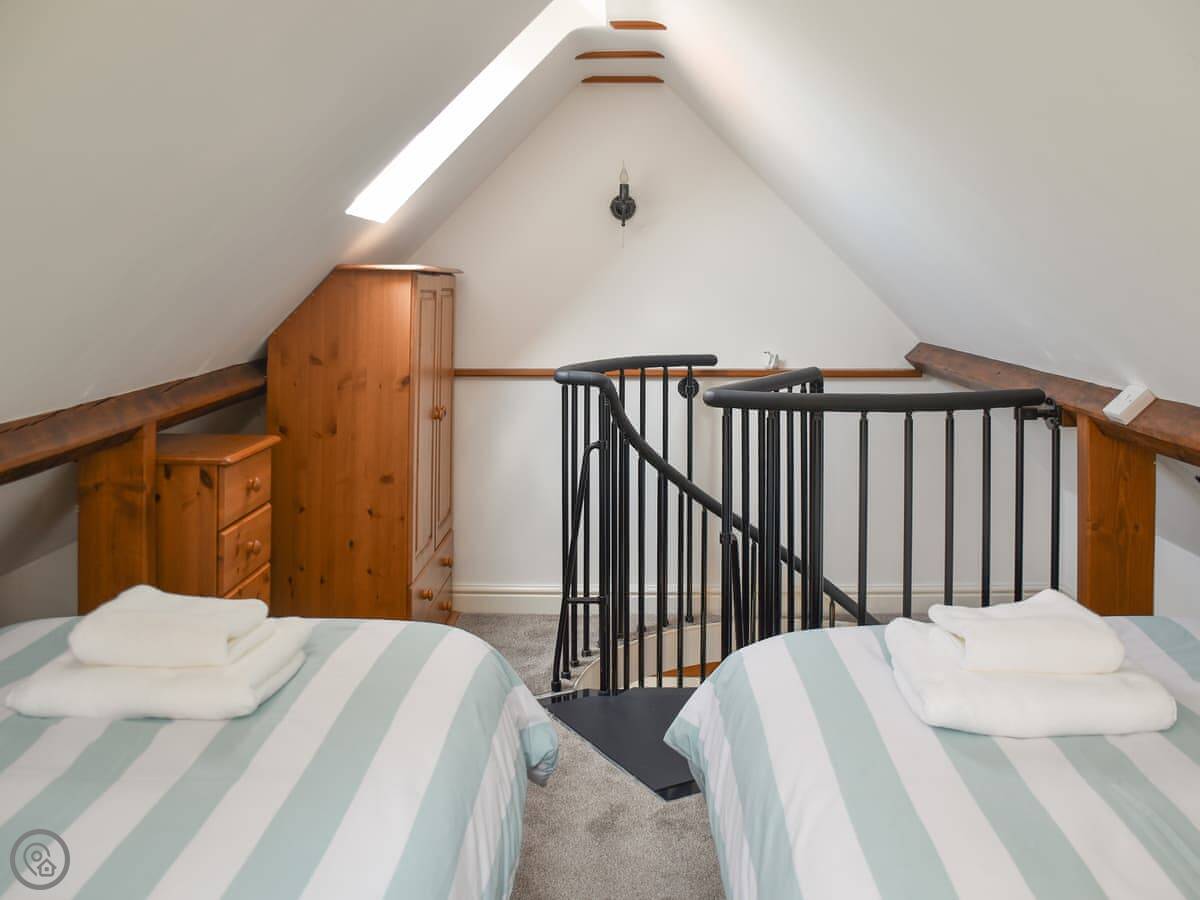 There are two spiral staircases, one up to each bedroom. They're quite tight, but they work. The twin room up one of them has a vaulted ceiling.