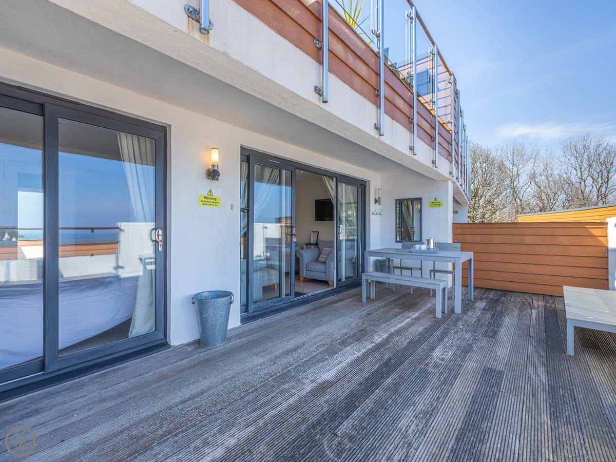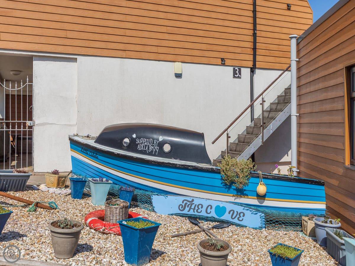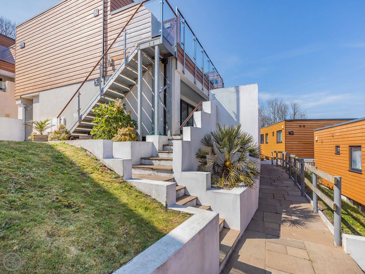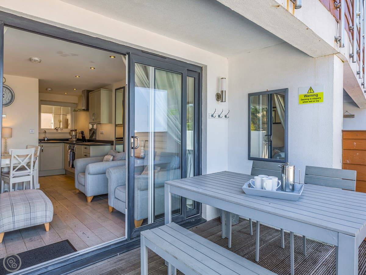 This is Number 5 Curlew at The Cove in Brixham. It's a flat, part of a modern block built into the hill in Fishcombe. You get a parking space, which is a big plus round here, and a small patio area out the front with a table.