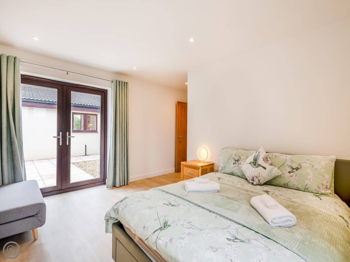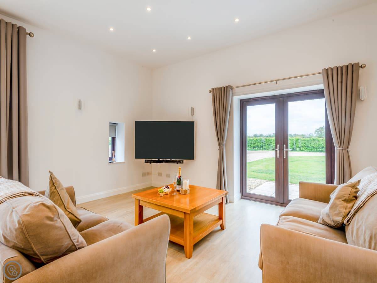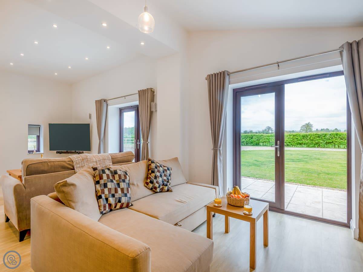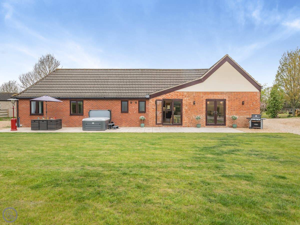 The main room is open plan, kitchen, dining, and living area. It's very light. The doors open out onto a big patio and the garden, which is fully enclosed. The hot tub is out there. The garden is a good size, plenty of room.