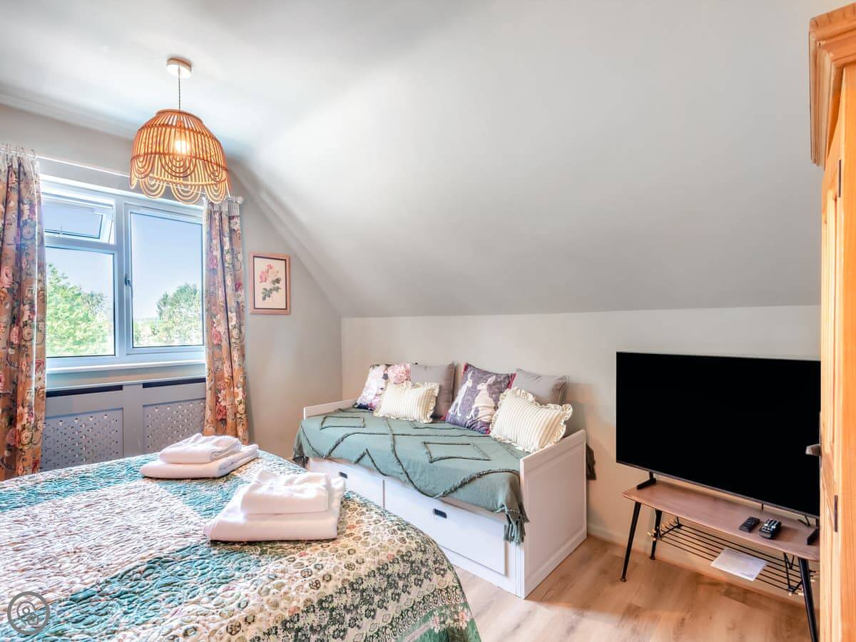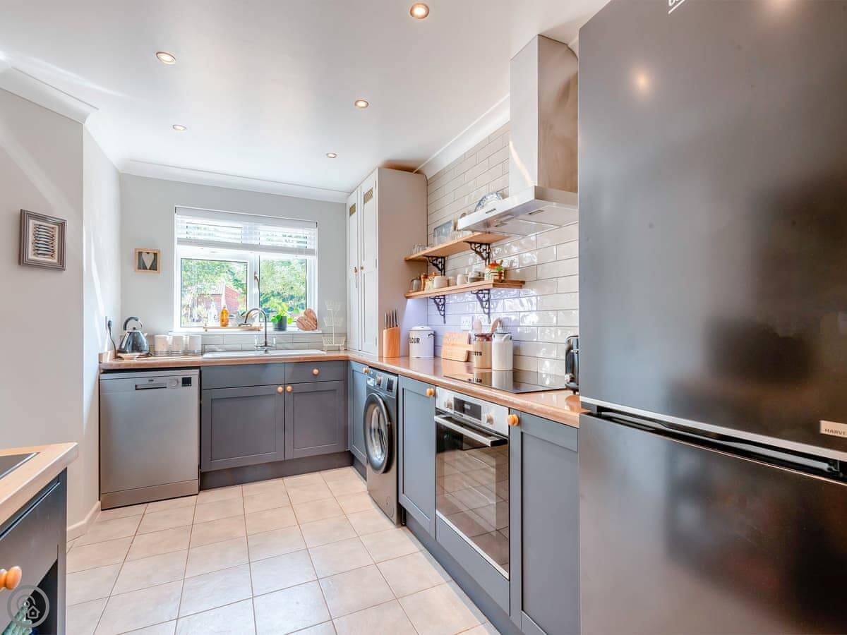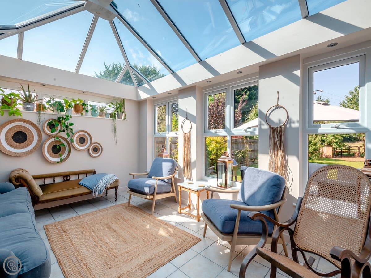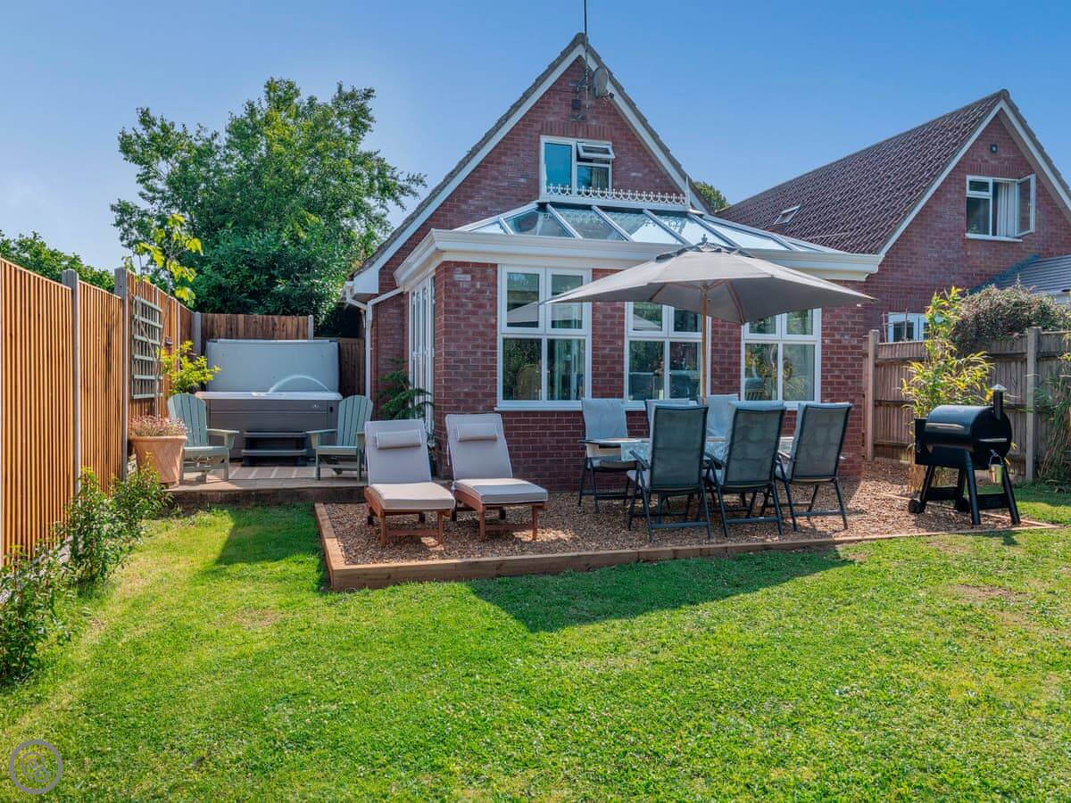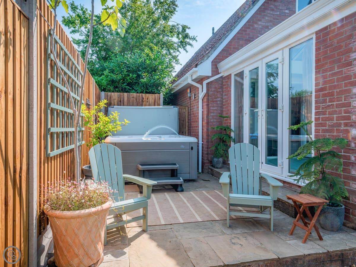 The main thing inside is the conservatory. It's big, gets the sun, and opens out onto the patio. The garden is enclosed, so it's safe for dogs and kids. There's a private hot tub out there too.