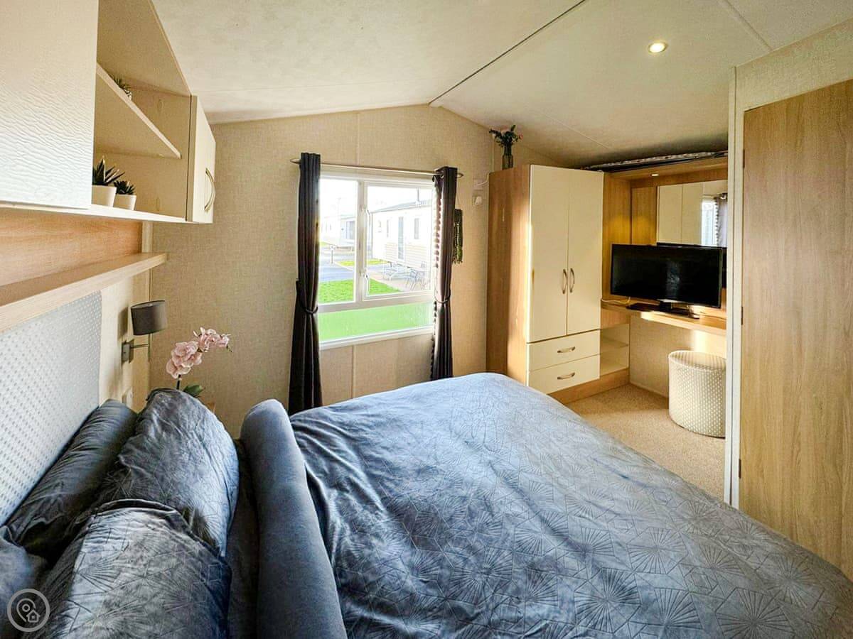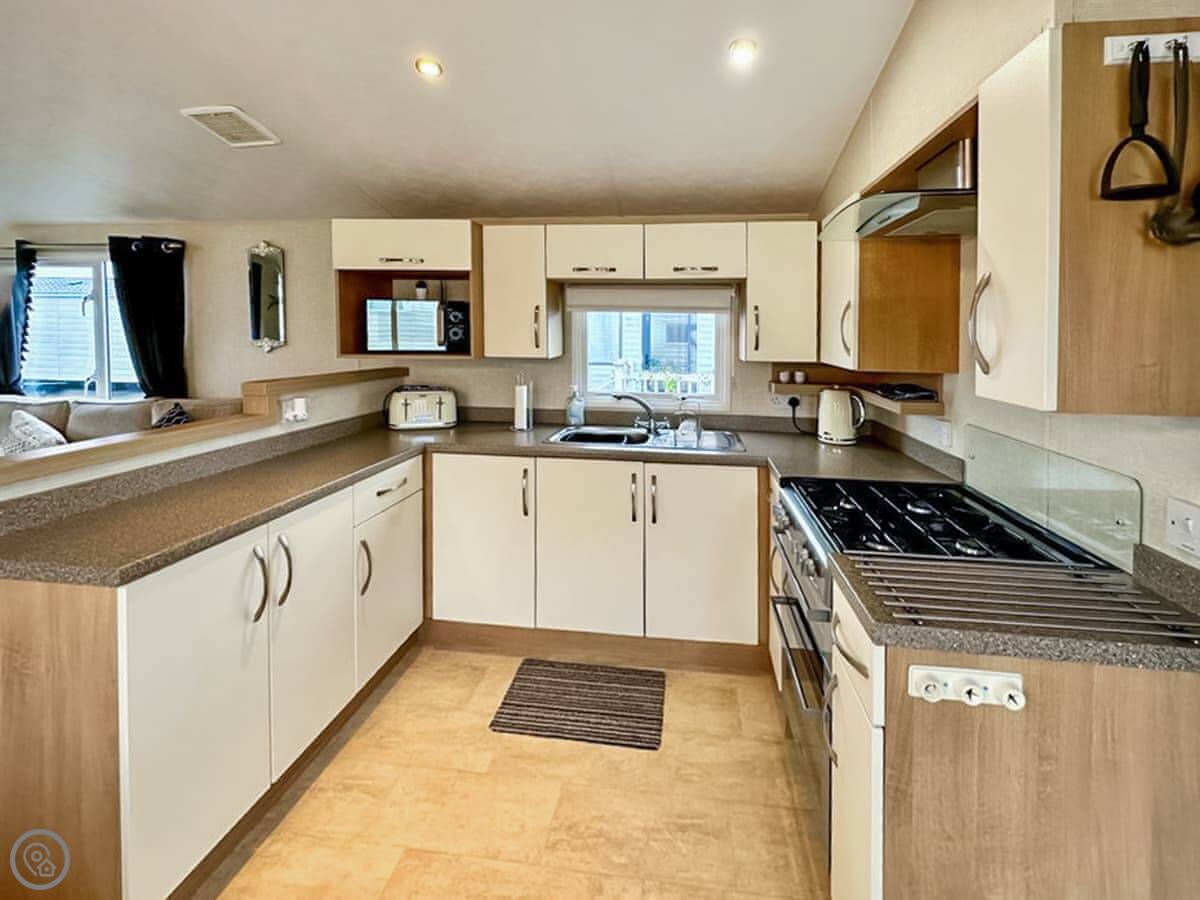 It's open-plan inside, lounge and kitchen together. You've got a TV and WiFi. Everything like bedding and towels is included, and there's parking right outside.