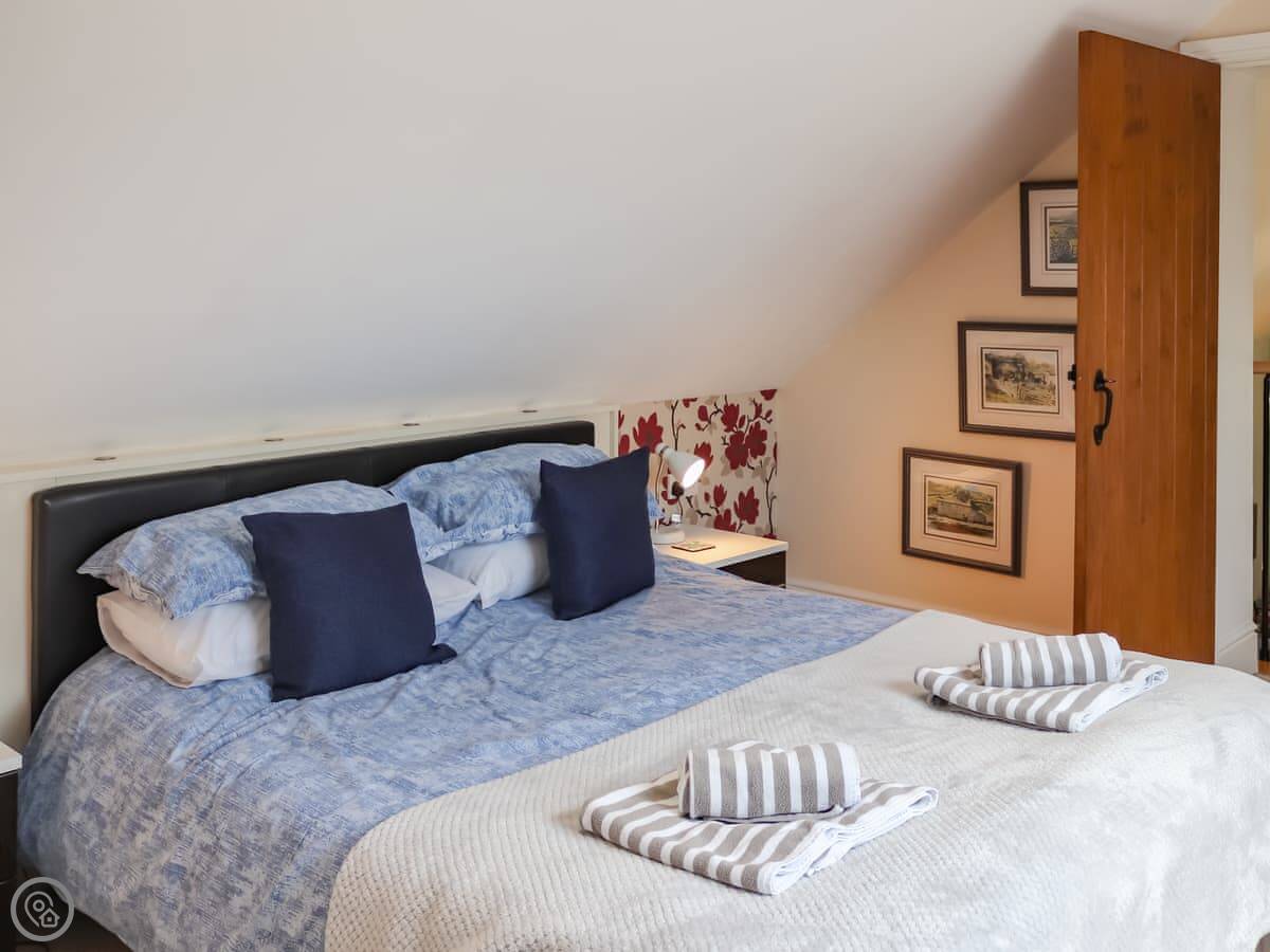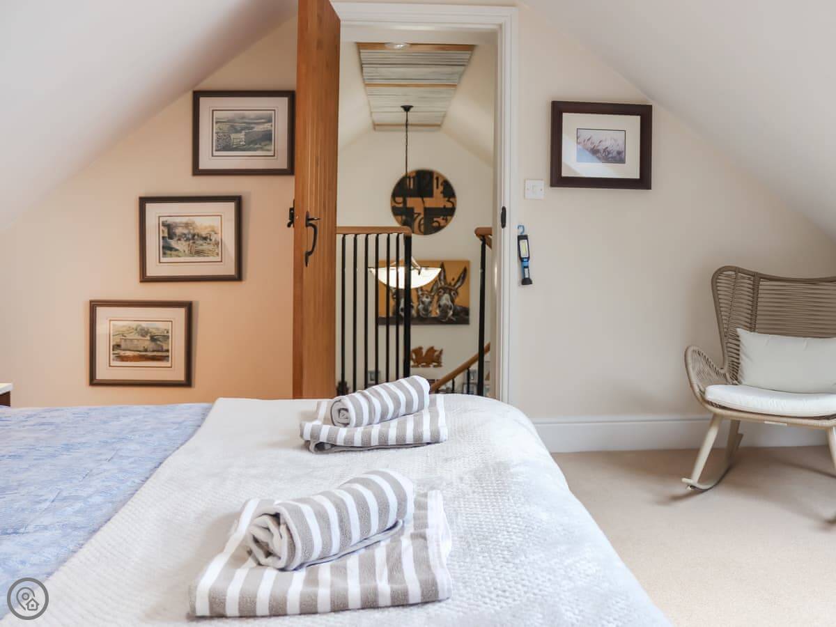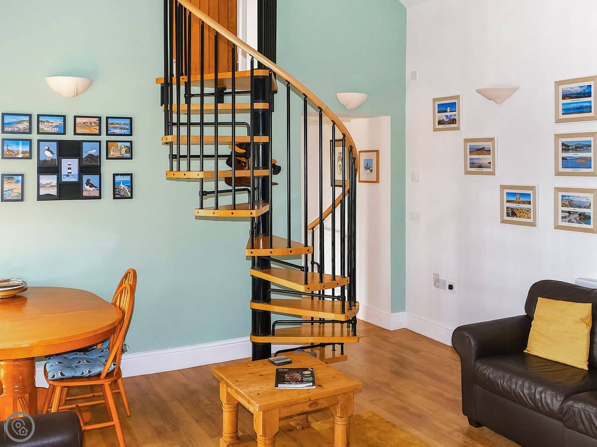 The main bedroom and a spacious shower room are on the ground floor. The second bedroom is upstairs and has its own ensuite. It's a spiral staircase to get up there, which is fine, just a bit tight. The lounge has a high ceiling and a log burner. The kitchen is modern and has a dishwasher and washing machine. The garden is enclosed.