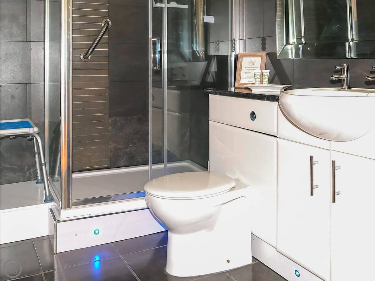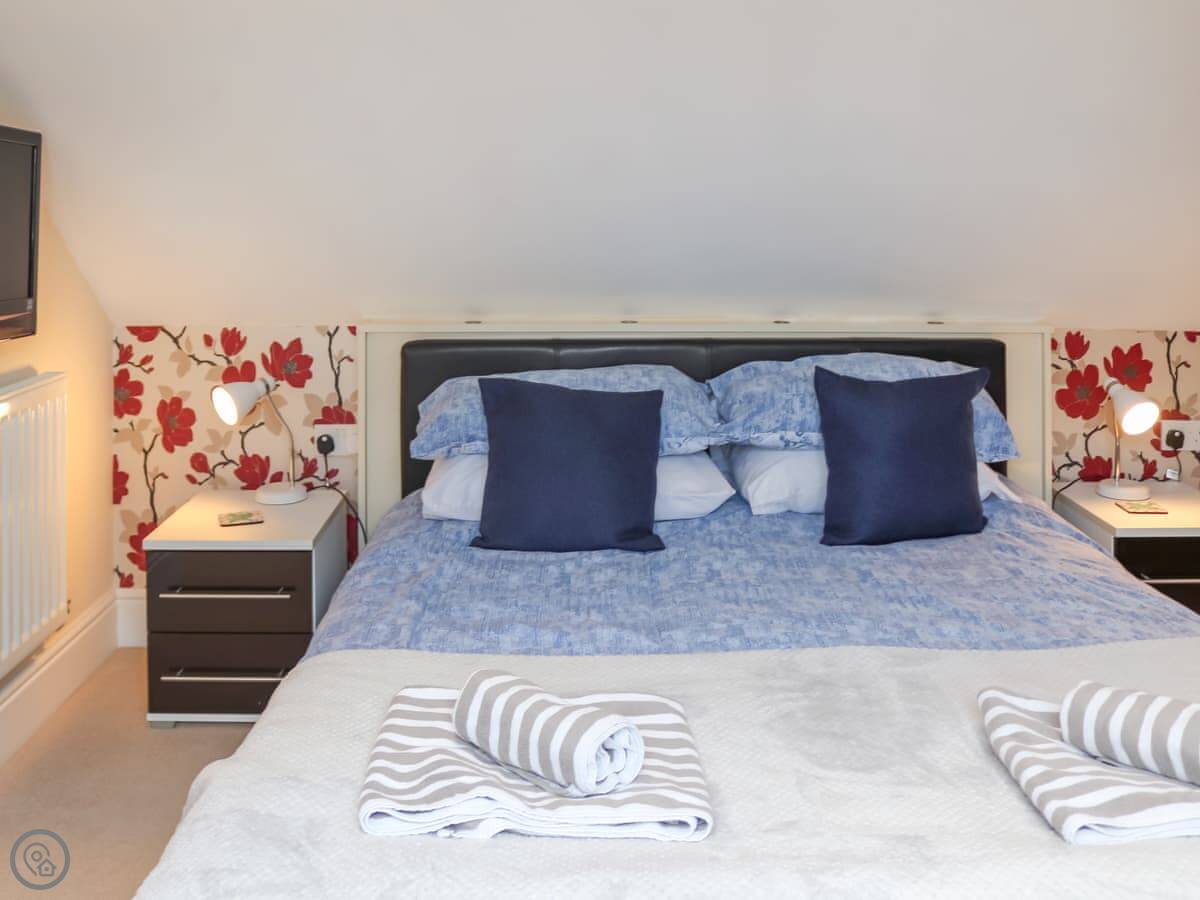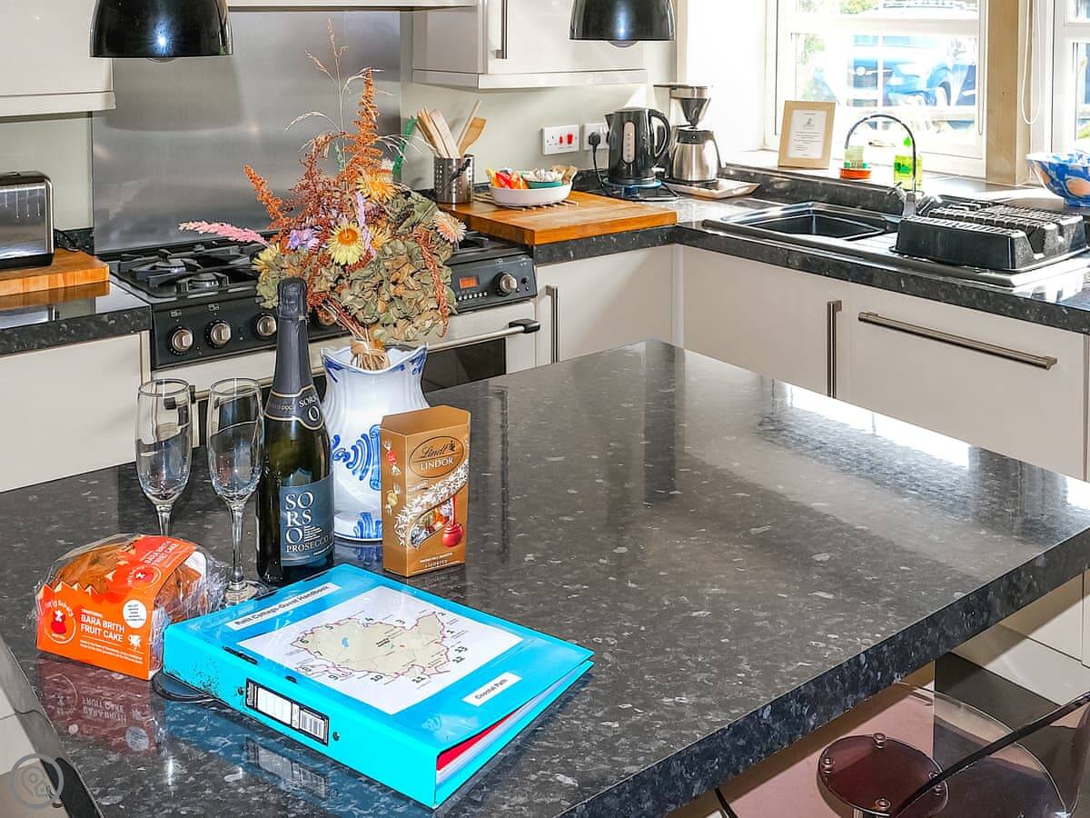 The main bedroom and a spacious shower room are on the ground floor. The second bedroom is upstairs and has its own ensuite. It's a spiral staircase to get up there, which is fine, just a bit tight. The lounge has a high ceiling and a log burner. The kitchen is modern and has a dishwasher and washing machine. The garden is enclosed.