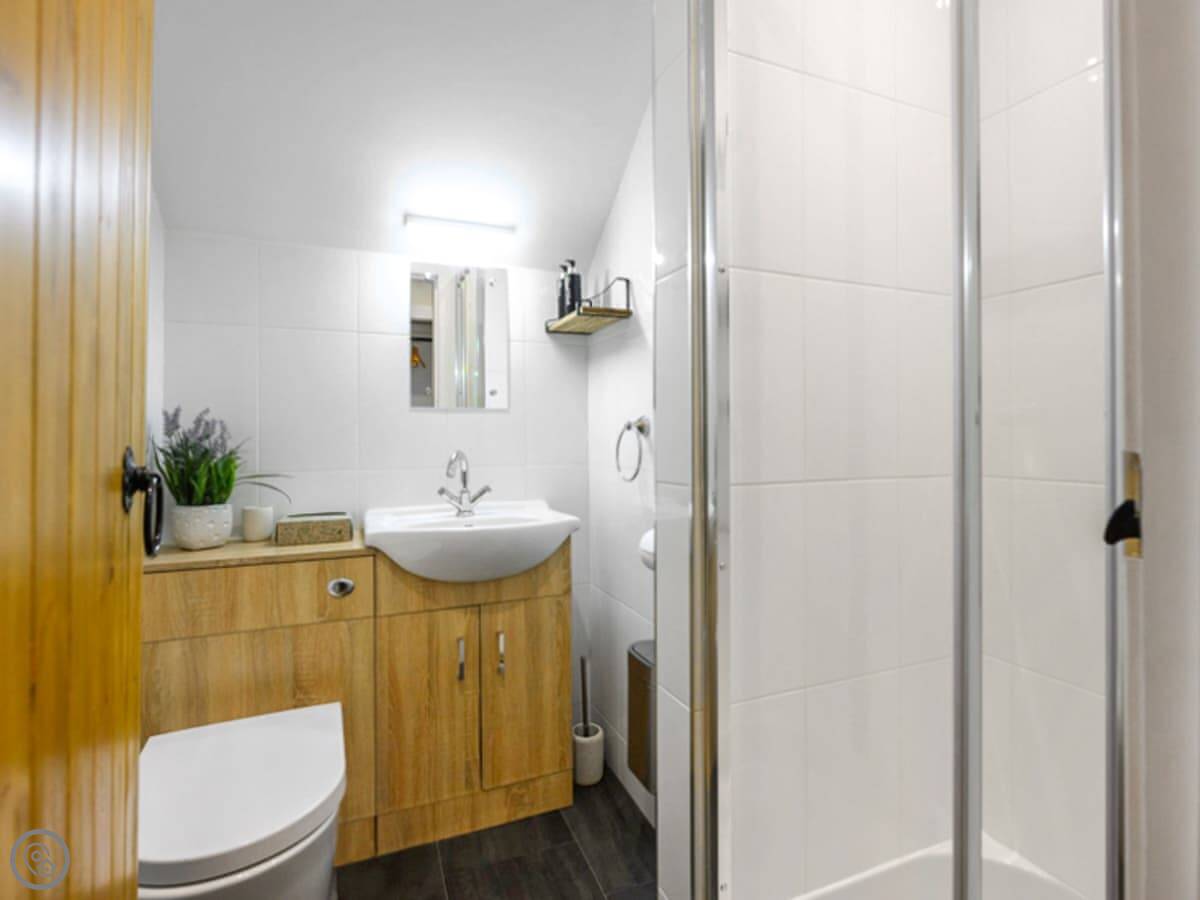 It sleeps four people in two double bedrooms. The main thing about the bedrooms is that they each have their own bathroom with a shower. It’s got a 4 Star rating. It’s modern and comfortable.
