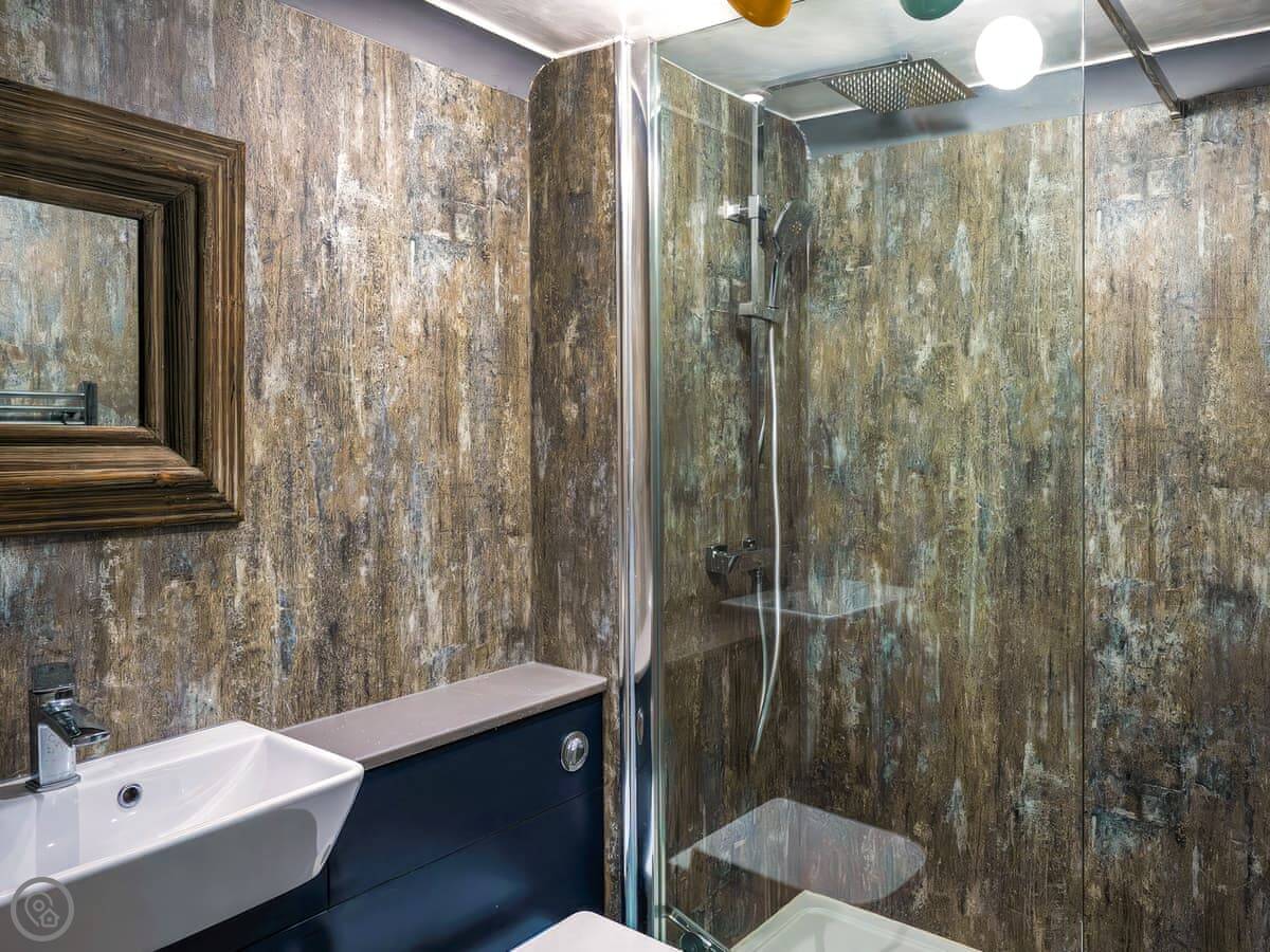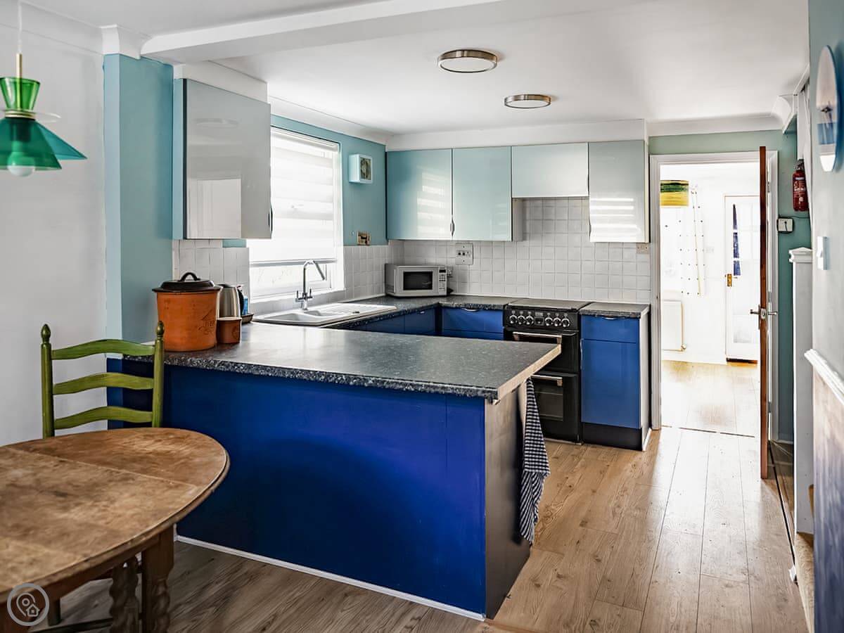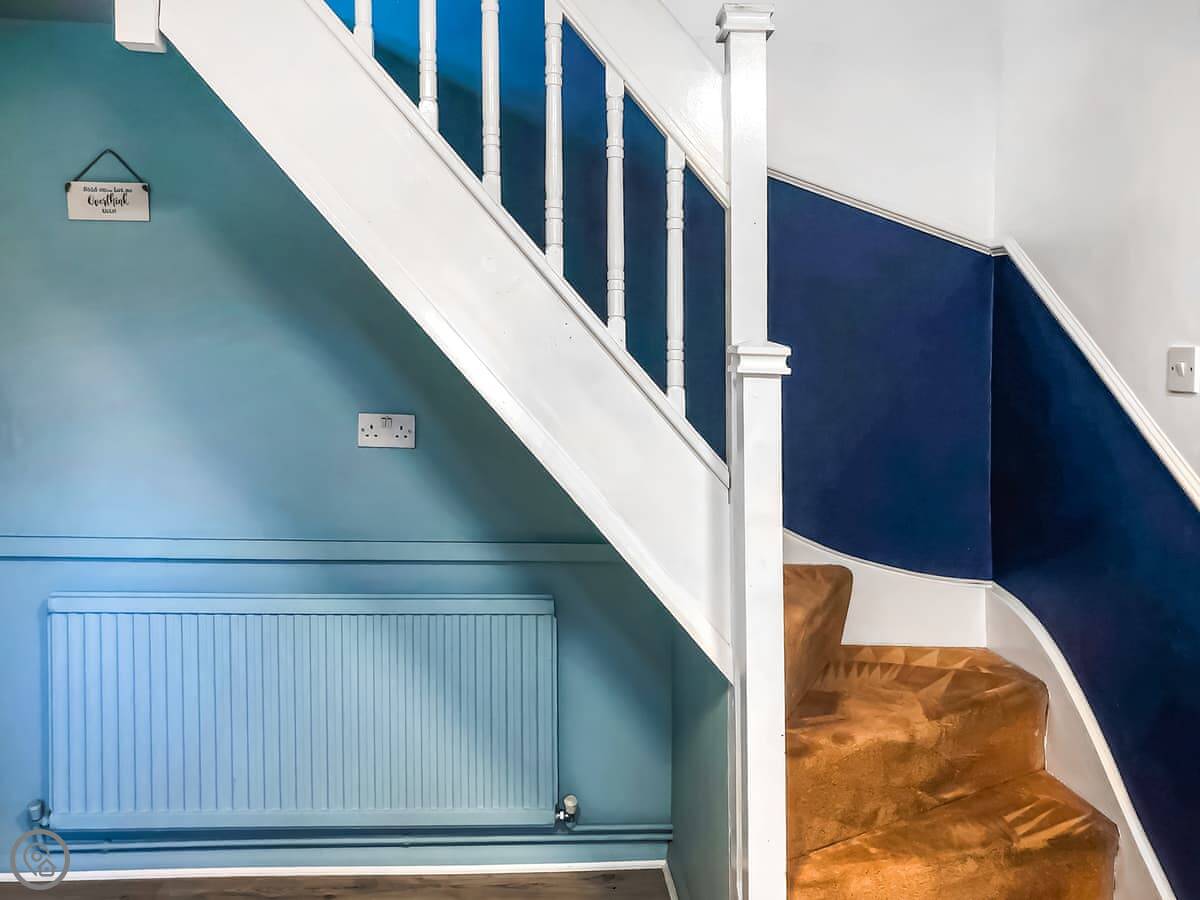 Inside, you've got the usual: a washing machine, TV, wifi. Bedding and towels are included. We can provide a cot and a highchair if you need them. There's a stairgate at the top.