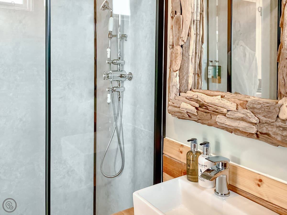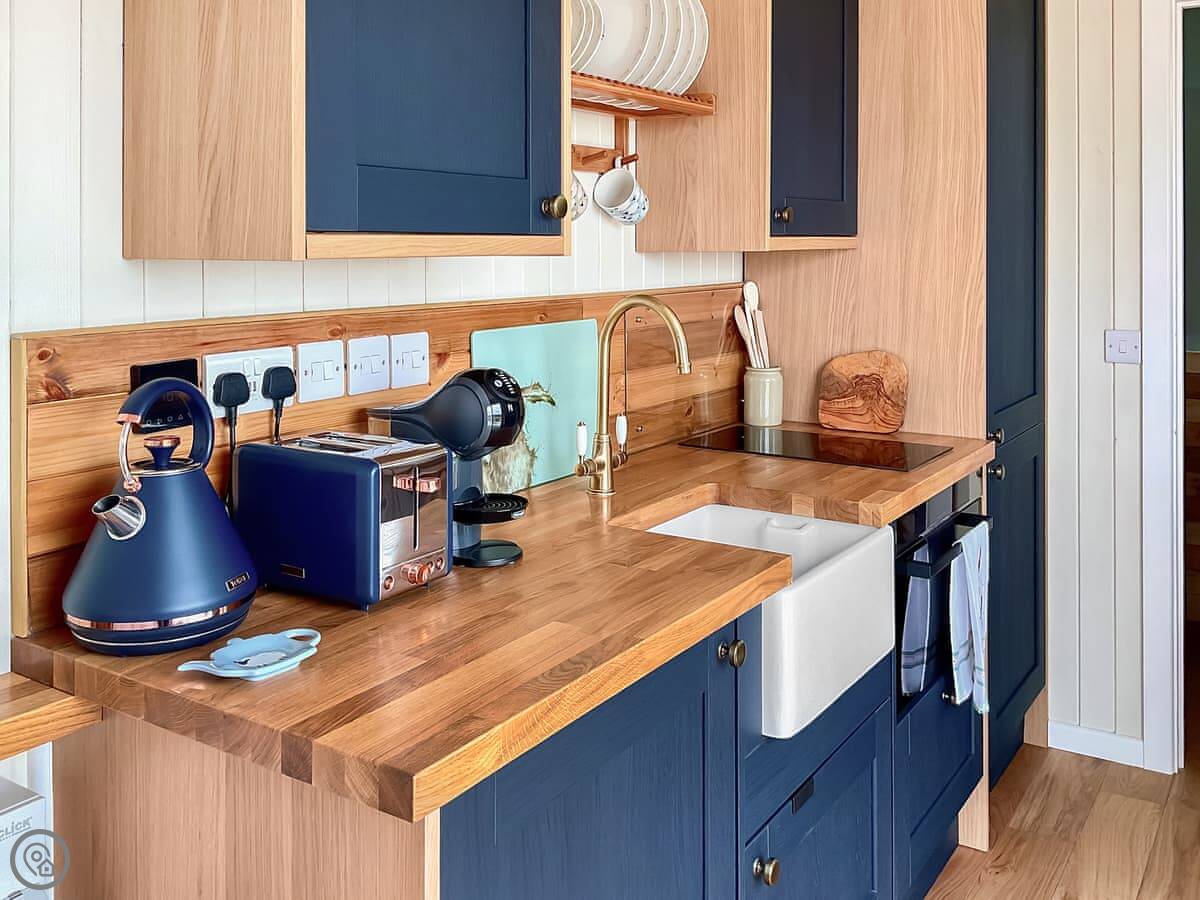 It sleeps two. One bedroom with a kingsize bed, one bathroom with a double shower. It's got a 4 Star rating. It's small, but it's well set up. There's a kitchen area with a hob, microwave, and a fridge with a small freezer compartment. Good for making breakfast and simple meals.