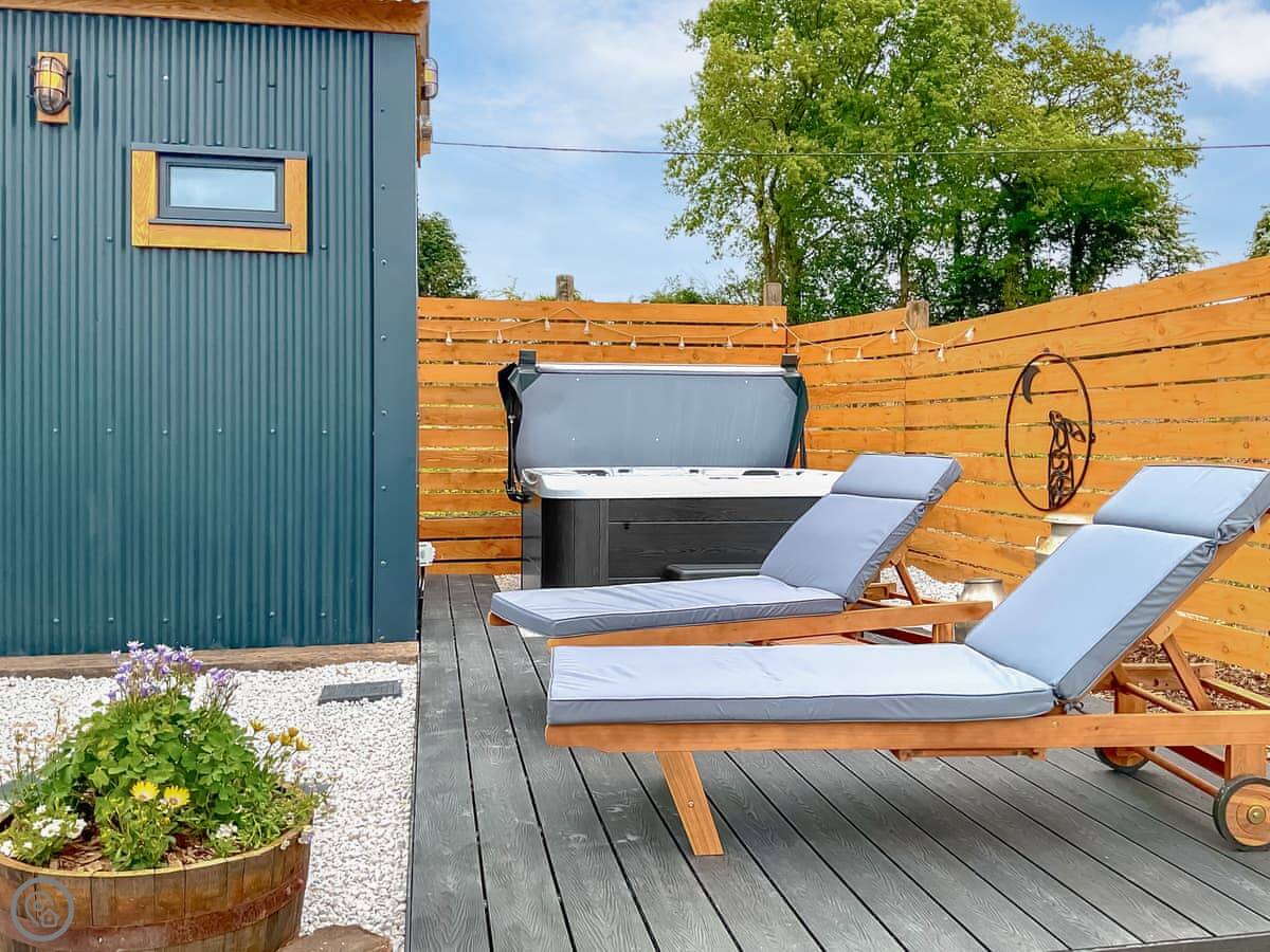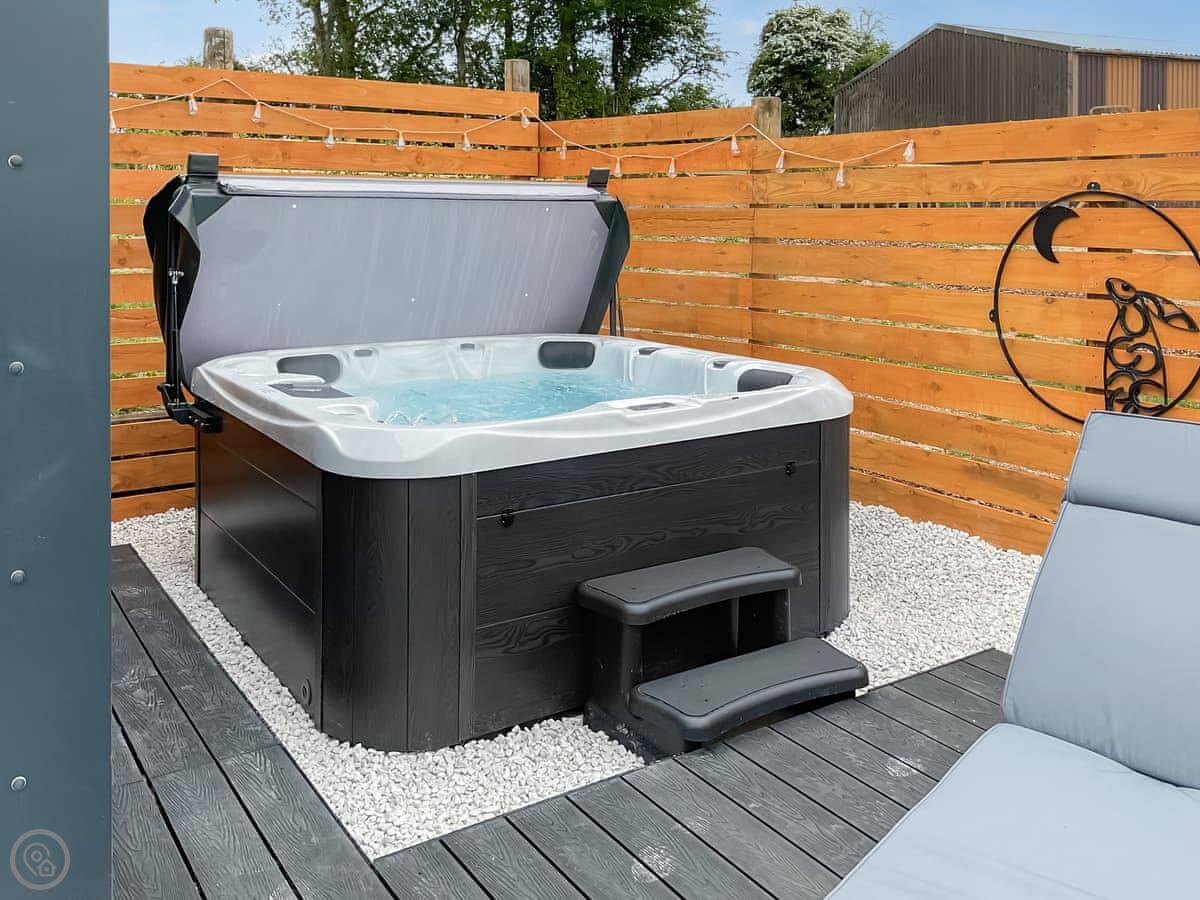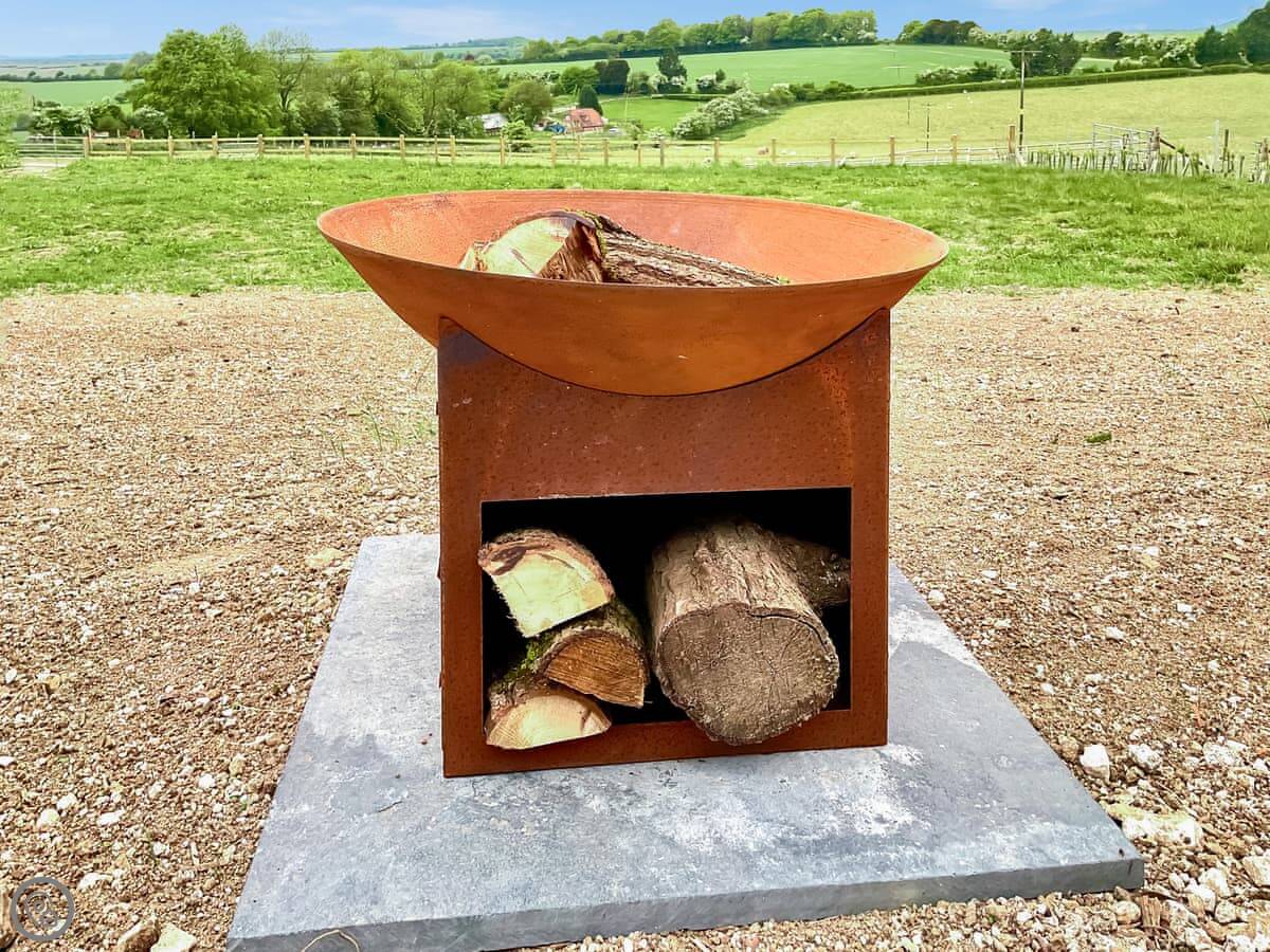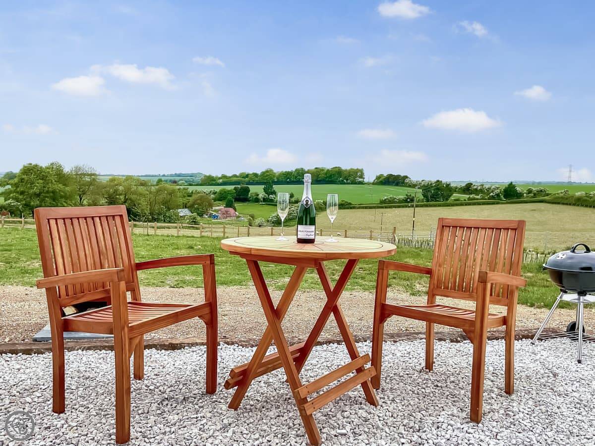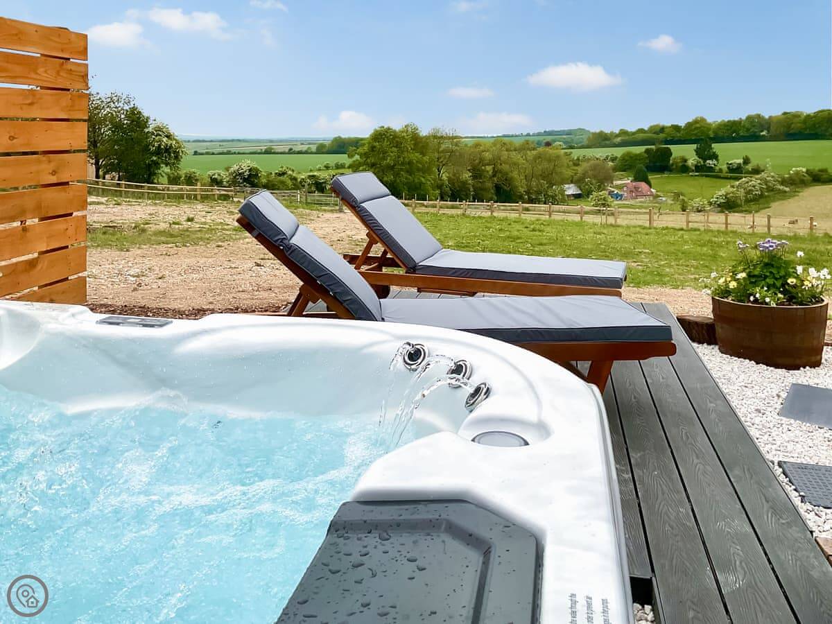 Outside is your own bit of garden. There's a hot tub and a fire pit. The view looks out towards the Watership Down hills. It's very quiet.
