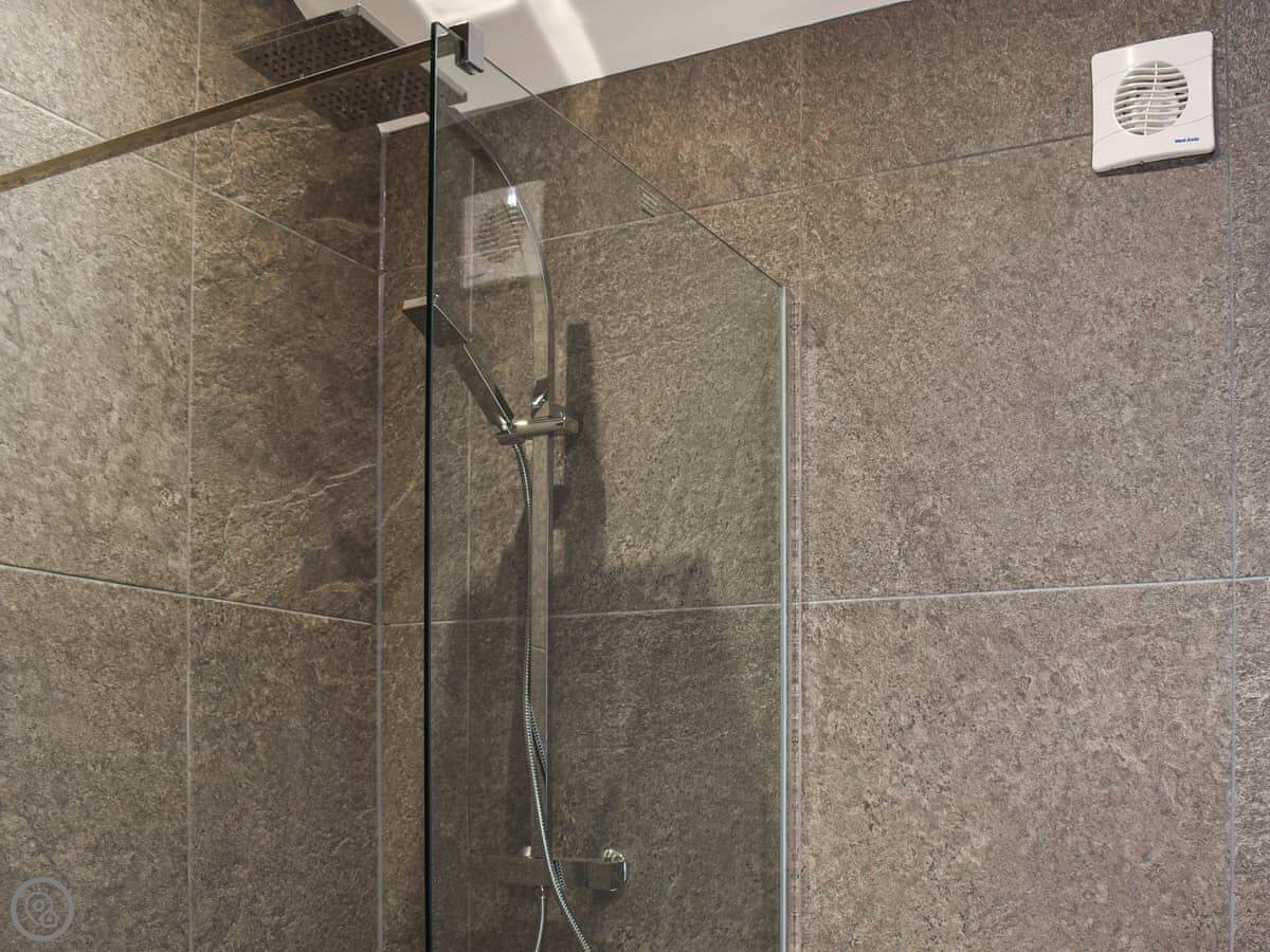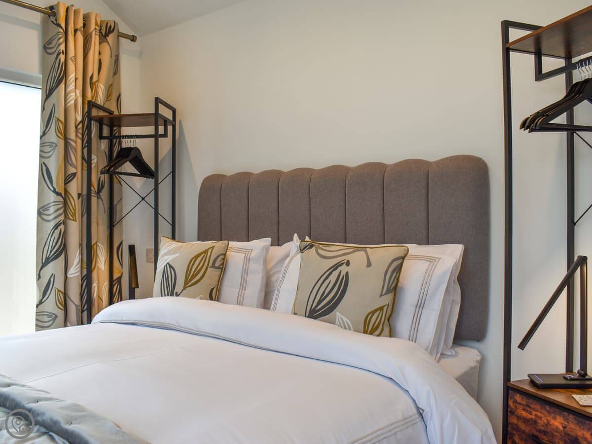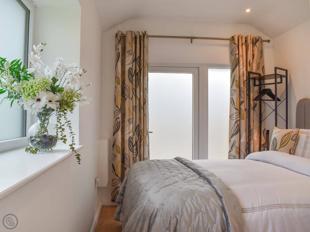 It's all on one level. The living space is open plan, so it's compact, but everything's there. There's a kingsize bed in the bedroom and a walk-in shower in the bathroom. The kitchenette is small, but it has a one-ring hob, a microwave, an air fryer, and a small fridge. Good for basic meals. There's a dining table inside and your own patio outside.