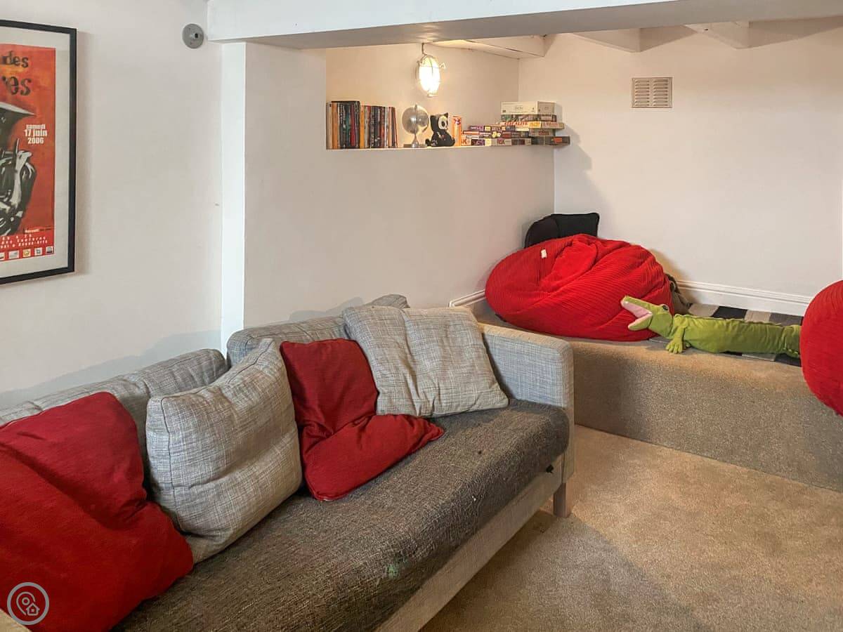 The kitchen is open plan with a dining table. The living room is separate. Downstairs there's a playroom for kids. It's got table football, bean bags, and games. There's also an old pinball machine from 1964. It works, but it's old, so it can be a bit funny sometimes.