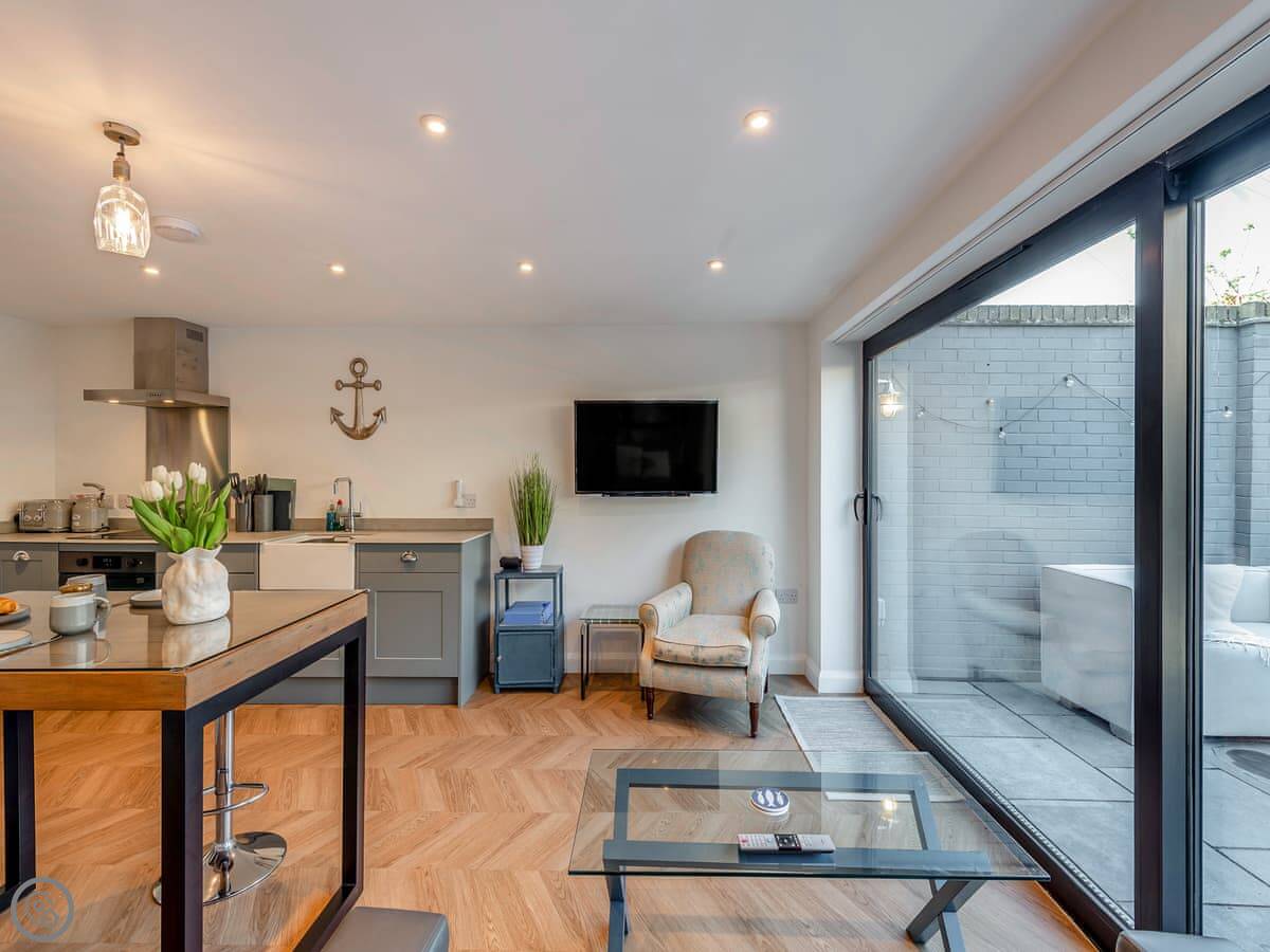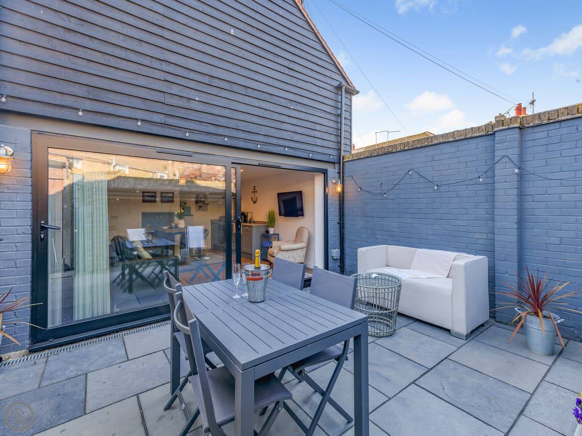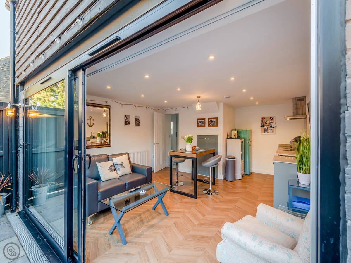 It's open plan downstairs with a kitchen area, and the bathroom has a walk in shower. Outside there's a patio that's just for you. It's enclosed, so it's private.